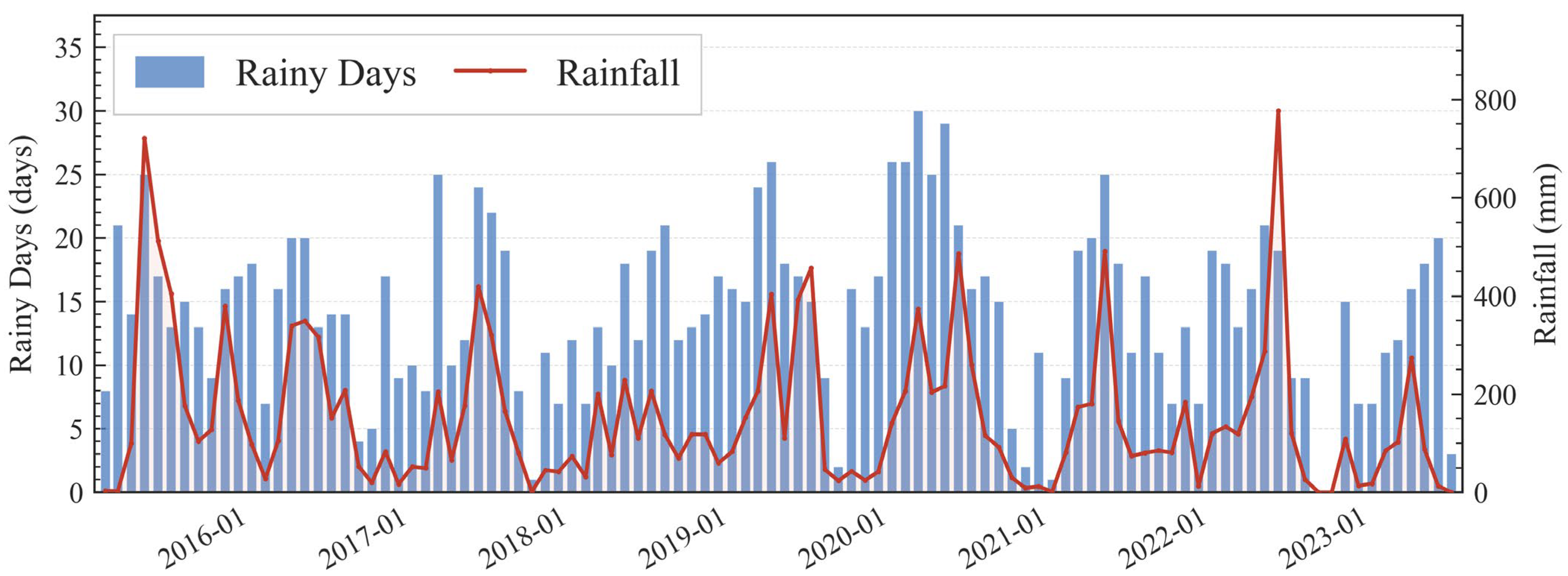Figure 1). The region experiences a typical subtropical monsoon climate, with a long-term mean annual precipitation of 1903.9 mm (