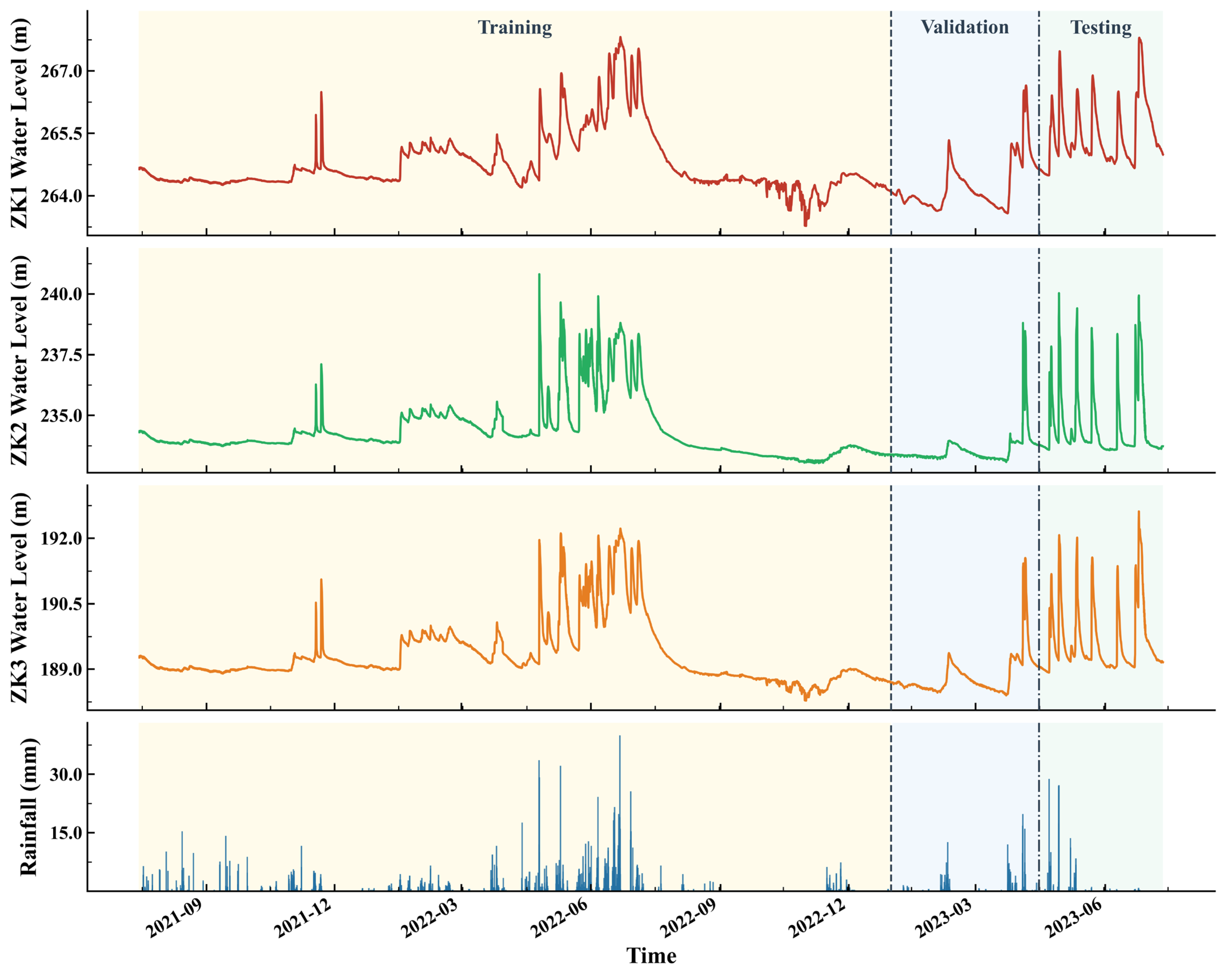 Following preprocessing, the dataset for model training comprised hourly precipitation and groundwater level observations from three monitoring wells, with each well containing 17,442 records (