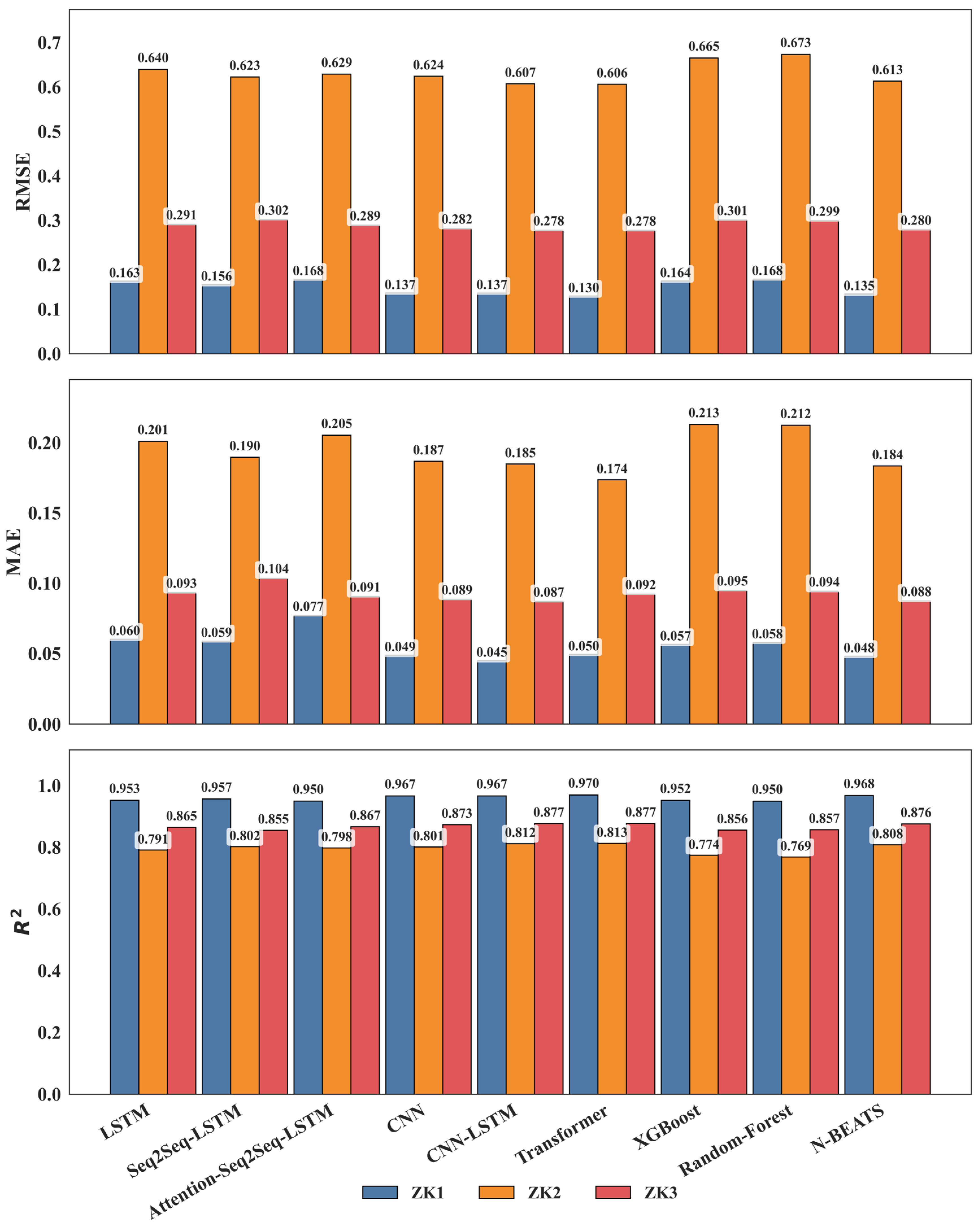 2 values across all three monitoring sites. The CNN-LSTM model also demonstrated strong predictive capability, ranking second only to the Transformer, and obtained lower MAE values than the Transformer at the ZK1 and ZK3 sites, consistent with prior studies [