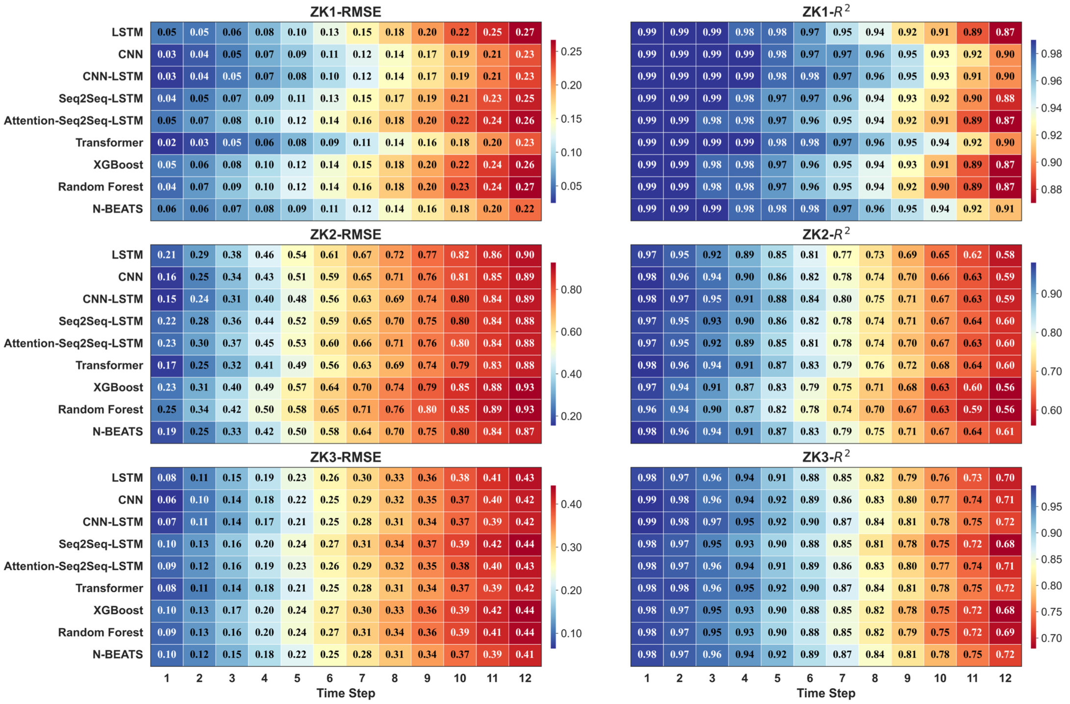 To evaluate the long-term prediction capability of each model, this study conducted 1 to 12-step prediction experiments at three monitoring sites (ZK1, ZK2, and ZK3), systematically analyzing the impact of prediction horizon on model performance using RMSE, MAE, and