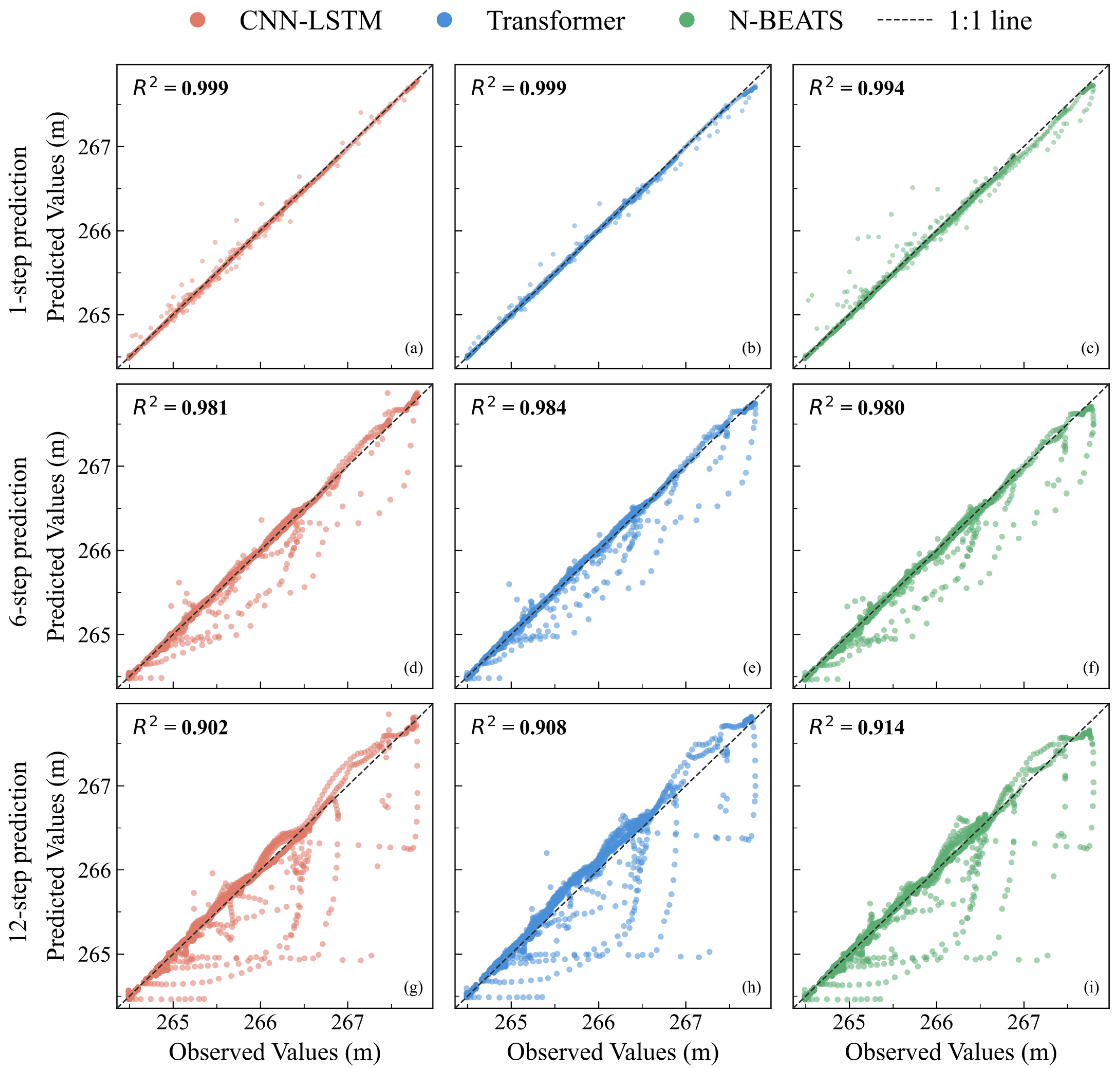 Figure 7 quantitatively evaluates the accuracy distribution and consistency of three typical deep learning models (CNN-LSTM, Transformer, and N-BEATS) across different prediction steps through scatter plots of predicted versus observed values.
