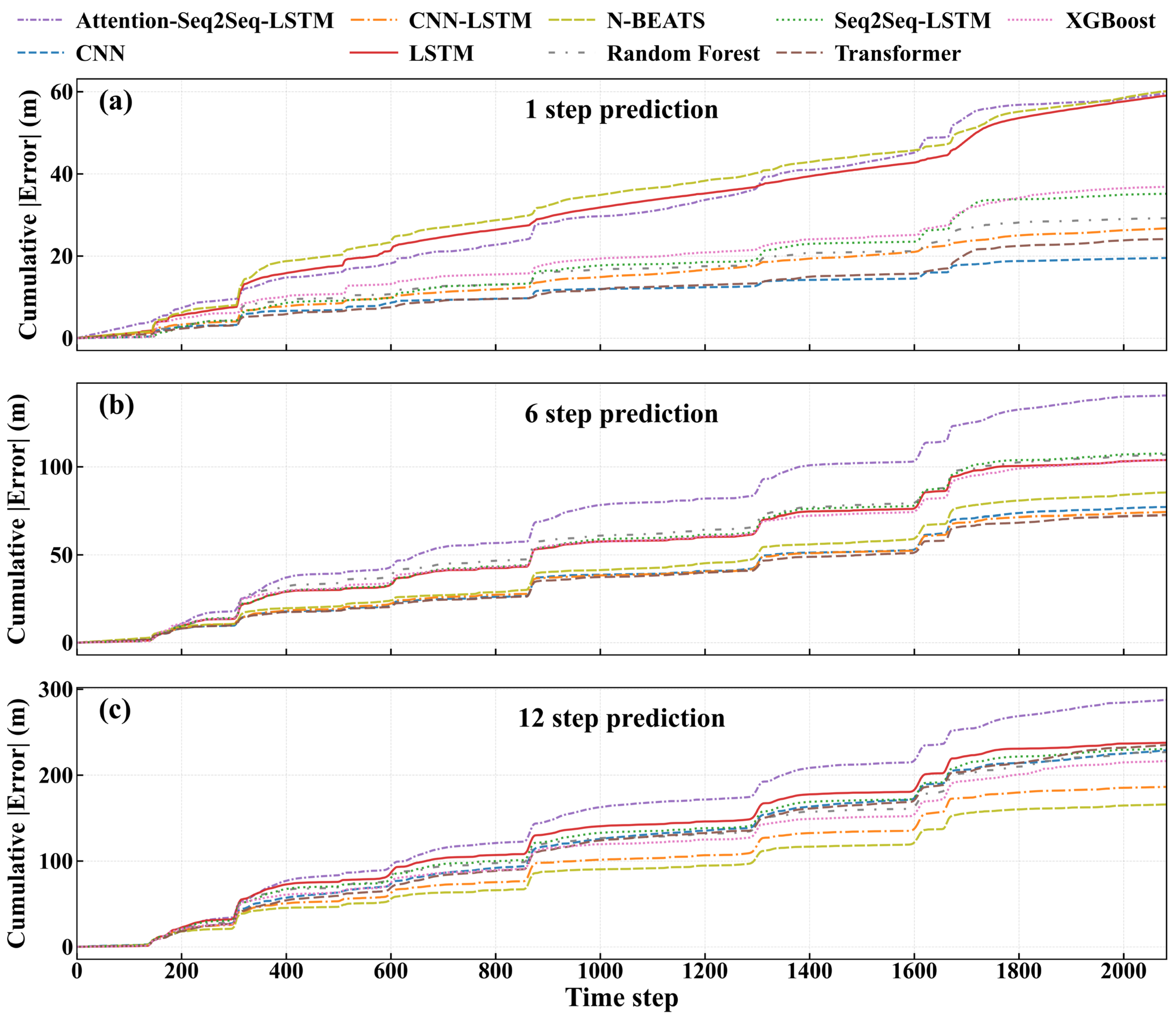 Figure 8 depicts the evolution of cumulative absolute errors over time during the testing period for each model, serving as a measure of their stability in long-term prediction. These three figures systematically reveal the evolution patterns of model performance with increasing prediction steps from three perspectives: temporal dynamic fitting, numerical accuracy performance, and error growth trends. Furthermore, to comprehensively assess model generalization capability under different hydrogeological conditions, the prediction time series and cumulative error evolution for the other two monitoring sites (ZK2 and ZK3) are presented in the