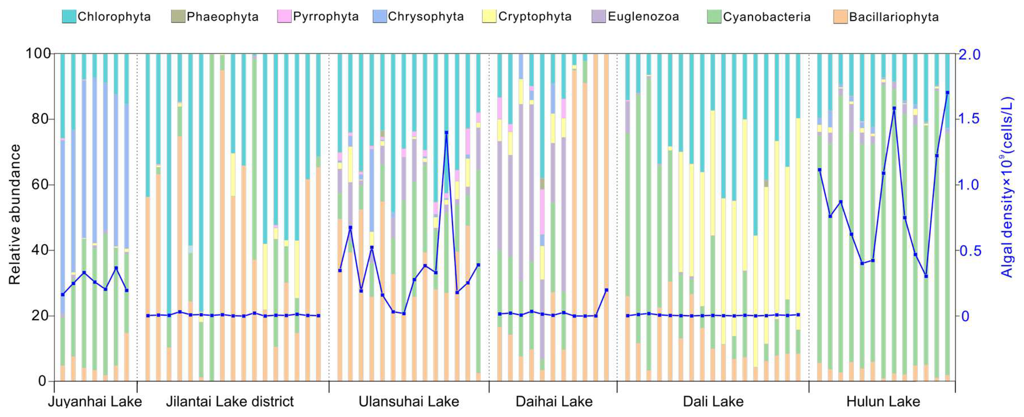 - Jia, J.; Chen, Q.; Ren, H.; Lu, R.; He, H.; Gu, P. Phytoplankton Composition and Their Related Factors in Five Different Lakes in China: Implications for Lake Management. Int. J. Environ. Res. Public Health 2022, 19, 3135. [Google Scholar] [CrossRef] [PubMed]