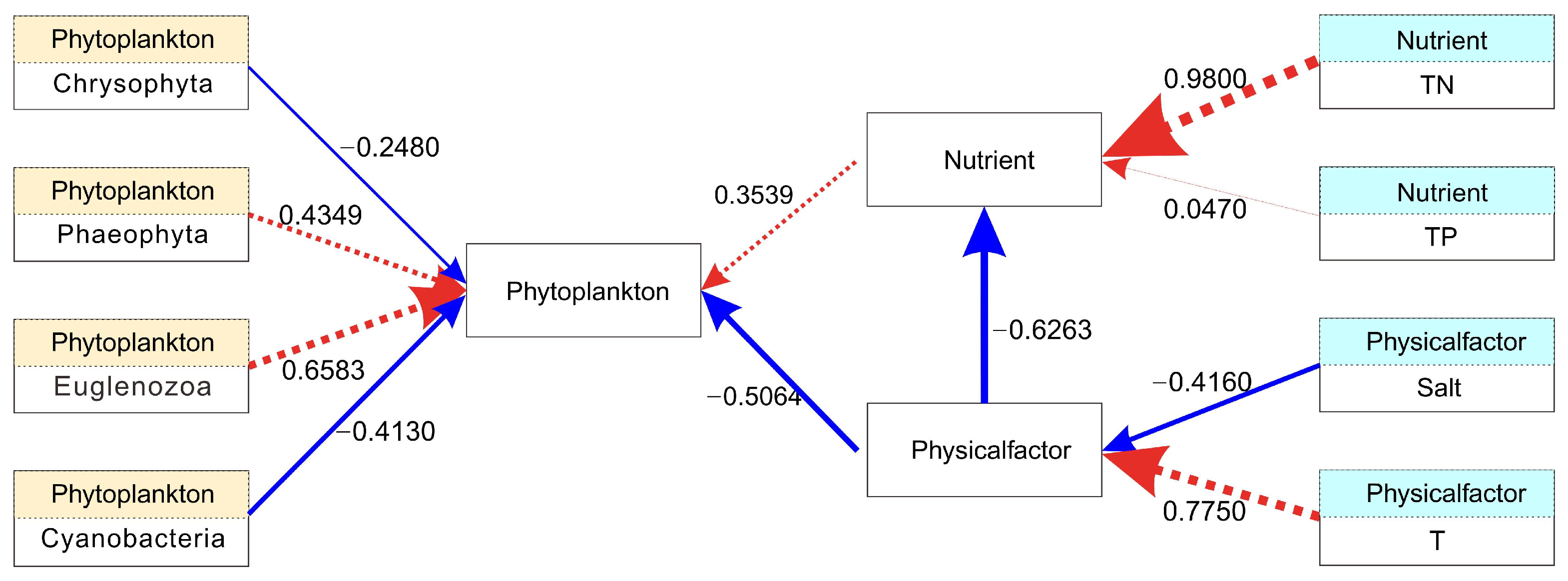 3.7. Structural Equation Model Analysis of Phytoplankton Species Composition