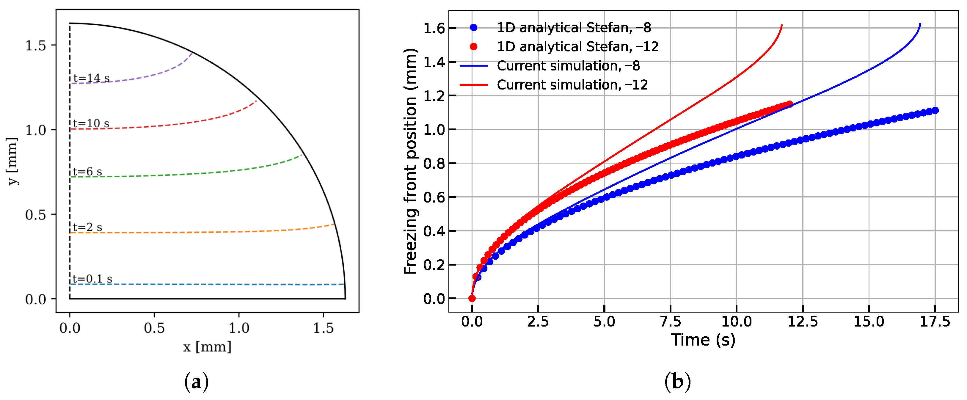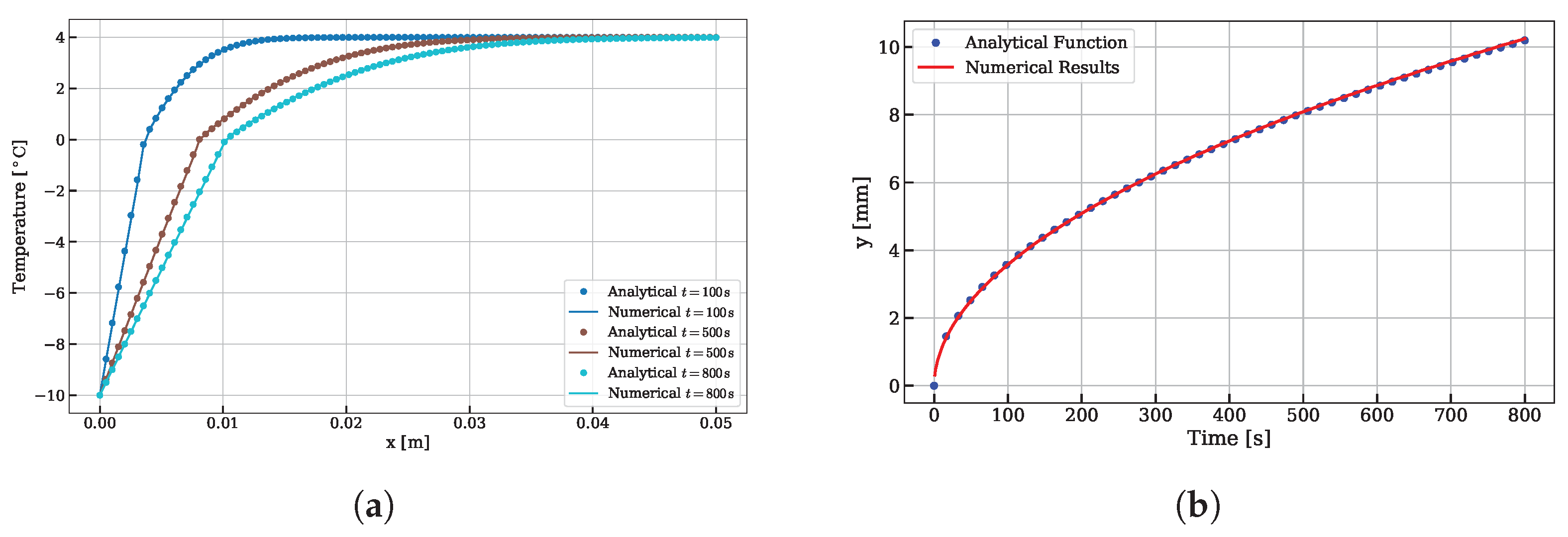 3.1.1. Verification of the Solidification Model Using the Analytical Stefan Solution