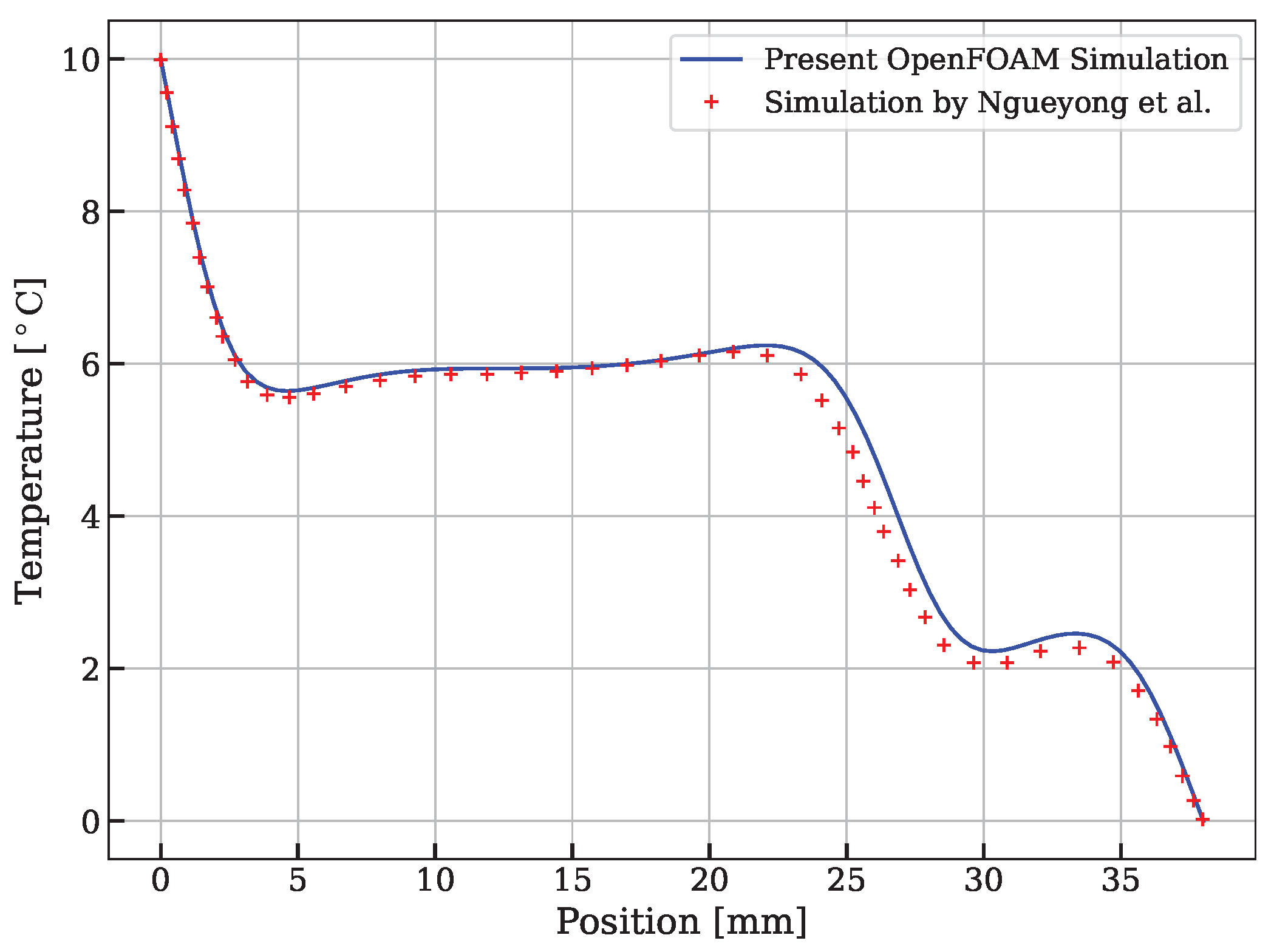 - The proposed OpenFOAM solver is successfully compared with experimental and numerical results for the case of flow and solidification in a cavity, confirming its accuracy for coupled phase-change and convection problems.