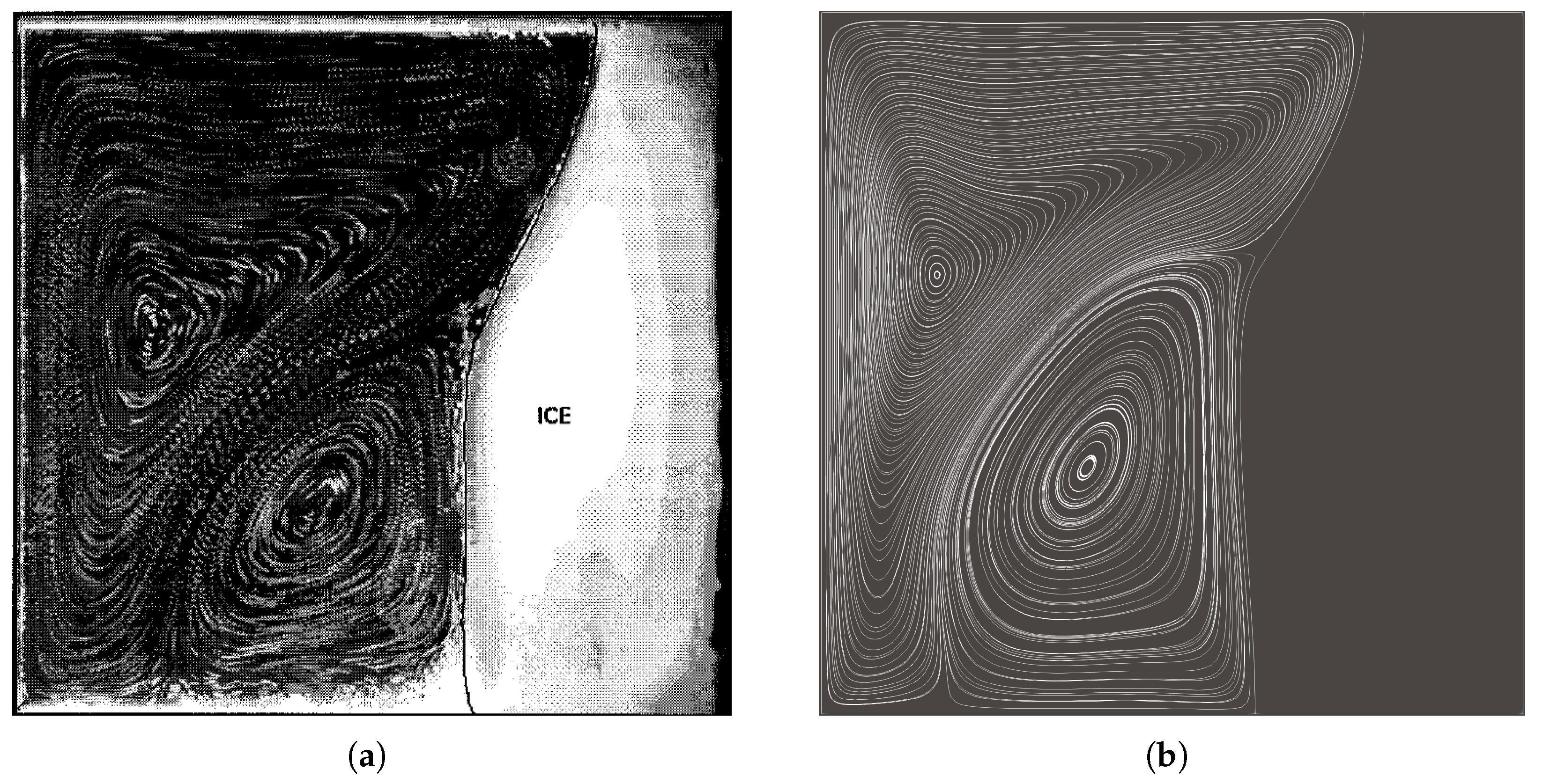 - Kowalewski, T.A.; Rebow, M. An experimental benchmark for freezing water in the cubic cavity. In CHT’97—Advances in Computational Heat Transfer. Proceedings of the International Symposium; Begell House, Inc.: Danbury, CT, USA, 1997. [Google Scholar]