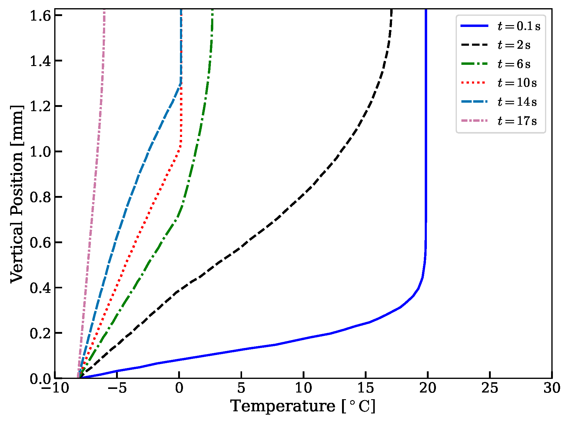 - Voulgaropoulos, V.; Kadivar, M.; Moghimi, M.A.; Maher, M.; Alawadi, H.; Matar, O.K.; Markides, C.N. A combined experimental and computational study of phase-change dynamics and flow inside a sessile water droplet freezing due to interfacial heat transfer. Int. J. Heat Mass Transf. 2021, 180, 121803. [Google Scholar] [CrossRef]