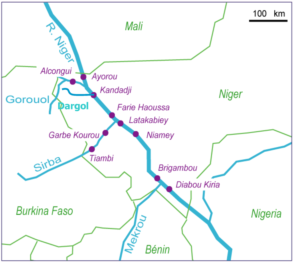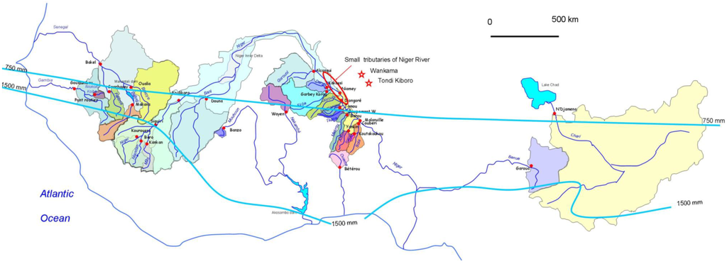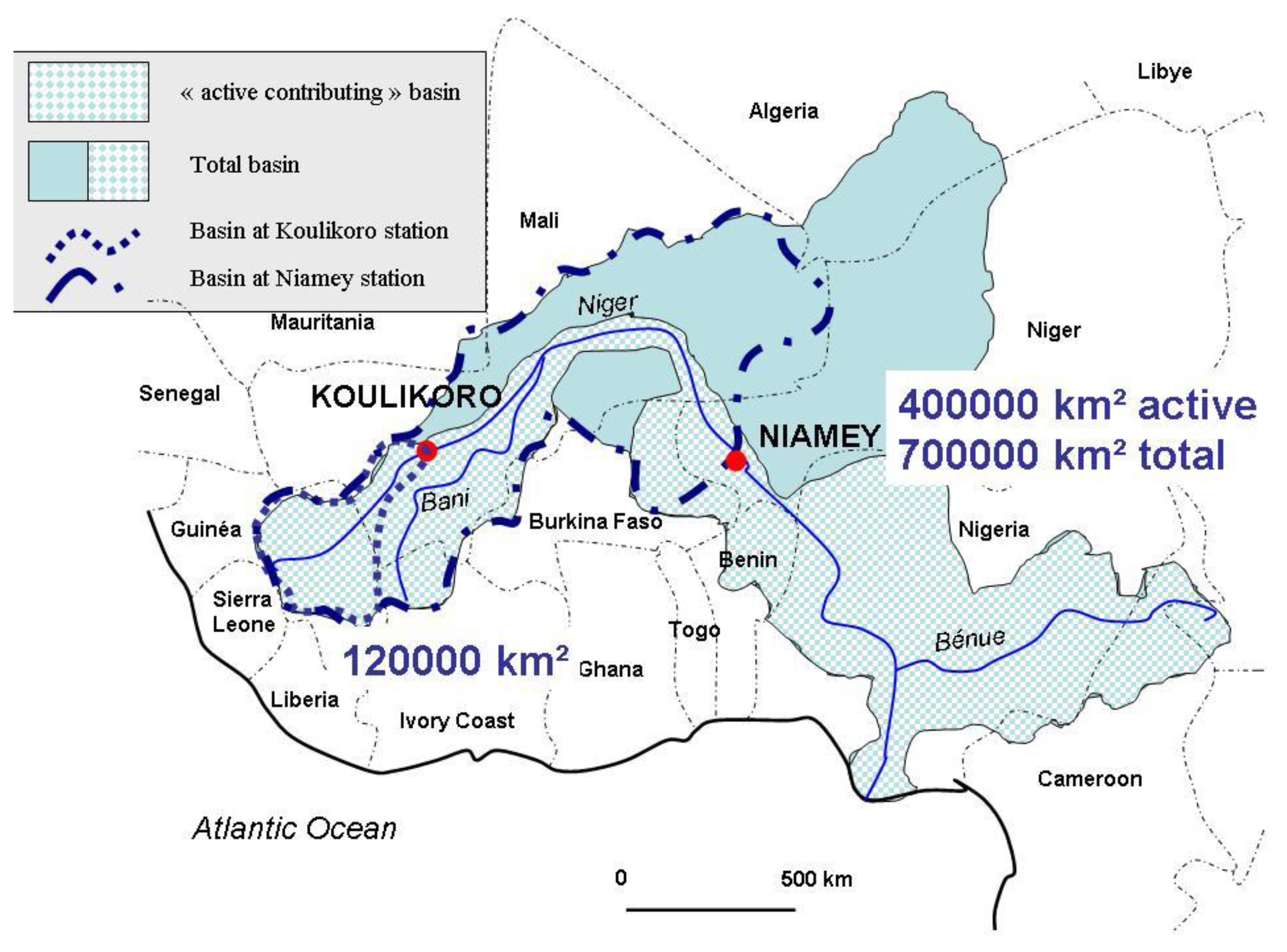 - Some small direct tributaries of the Niger River; despite discharges are registered since 2008 in two catchments near Niamey (Niger), we only use here the regional balance allowed by the comparison of data of the stations located in the Niger River upstream (Kandadji) and downstream (Niamey) the studied stretch