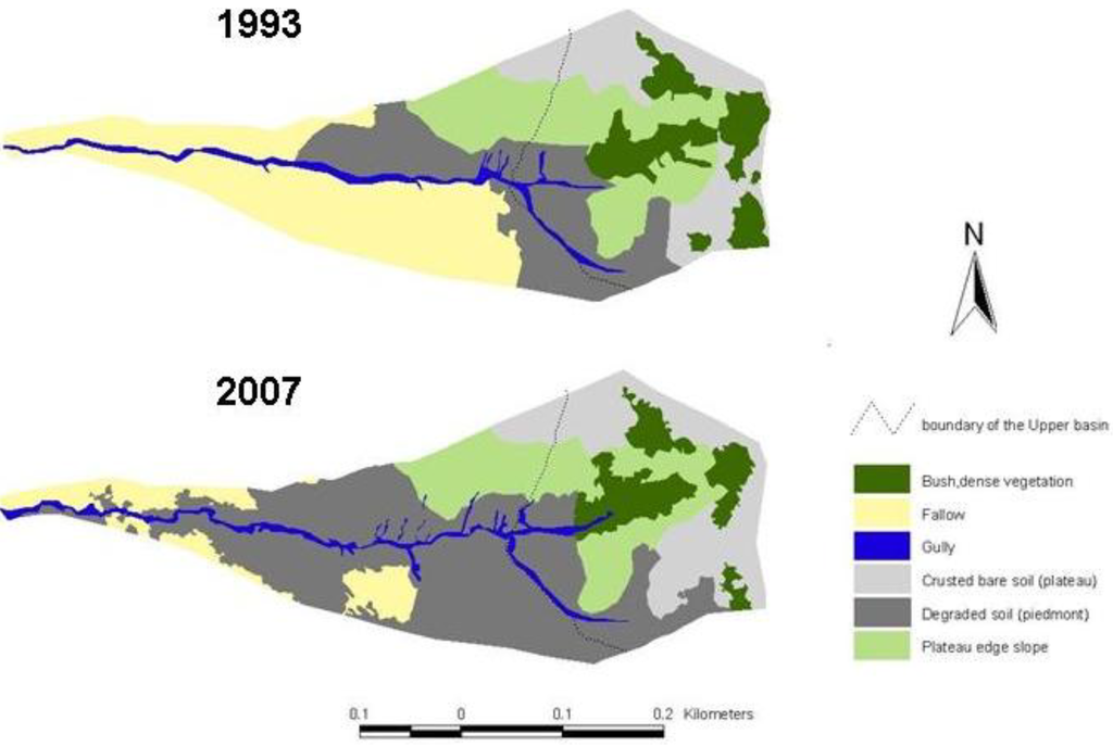 Effectively, some land use mapping allowed us to compare the situation of land cover for two periods: 1991–1994 and 2004–2008 for two small catchments of approximately 12 hectares near Tondi Kiboro, and near Banizoumbou, 70 km east of Niamey. Figure 2 shows the land use change in this micro-catchment between 1993 and 2007.