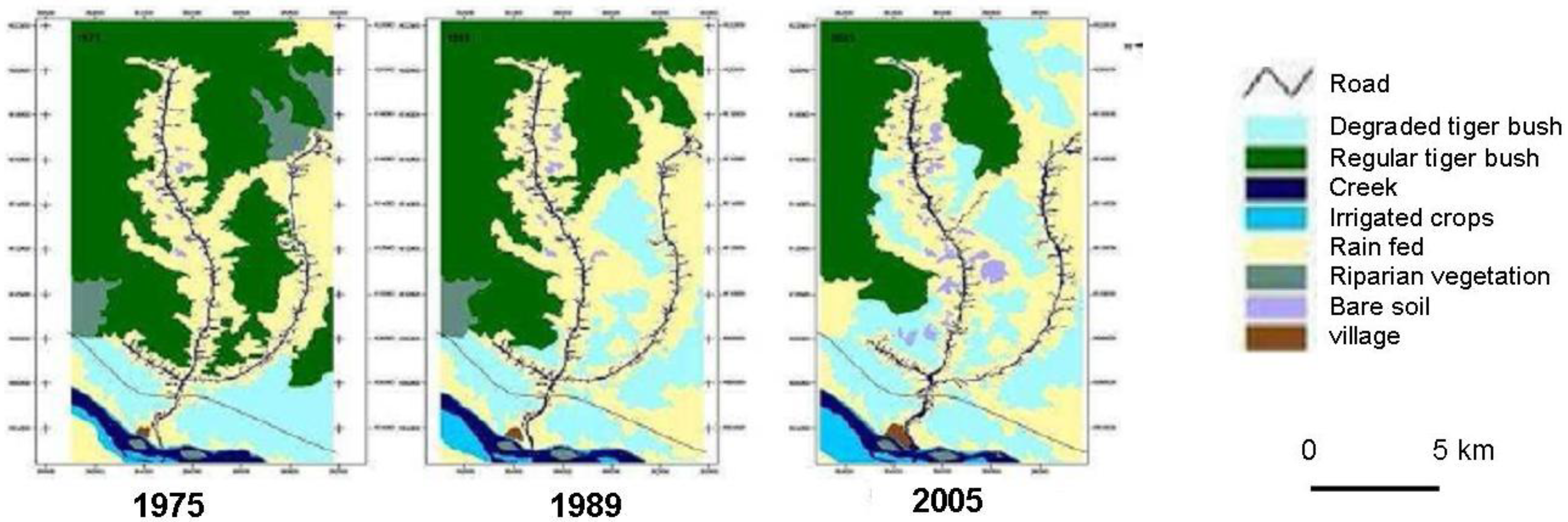 Figure 2 shows a strong increase in bare and degraded soils from 1993 to 2007, which were 16% of the total area in 1993 and 38% in 2007. This seems representative of the regional trend. In the nearby catchment of Wankama, a monitoring of LULC since 1950 using aerial photographs indicated that degraded soils covered 5% of this 1.5 km2 catchment in 1950, 17% in 1975, 31% in 1992 and 47% in 2005 [48].