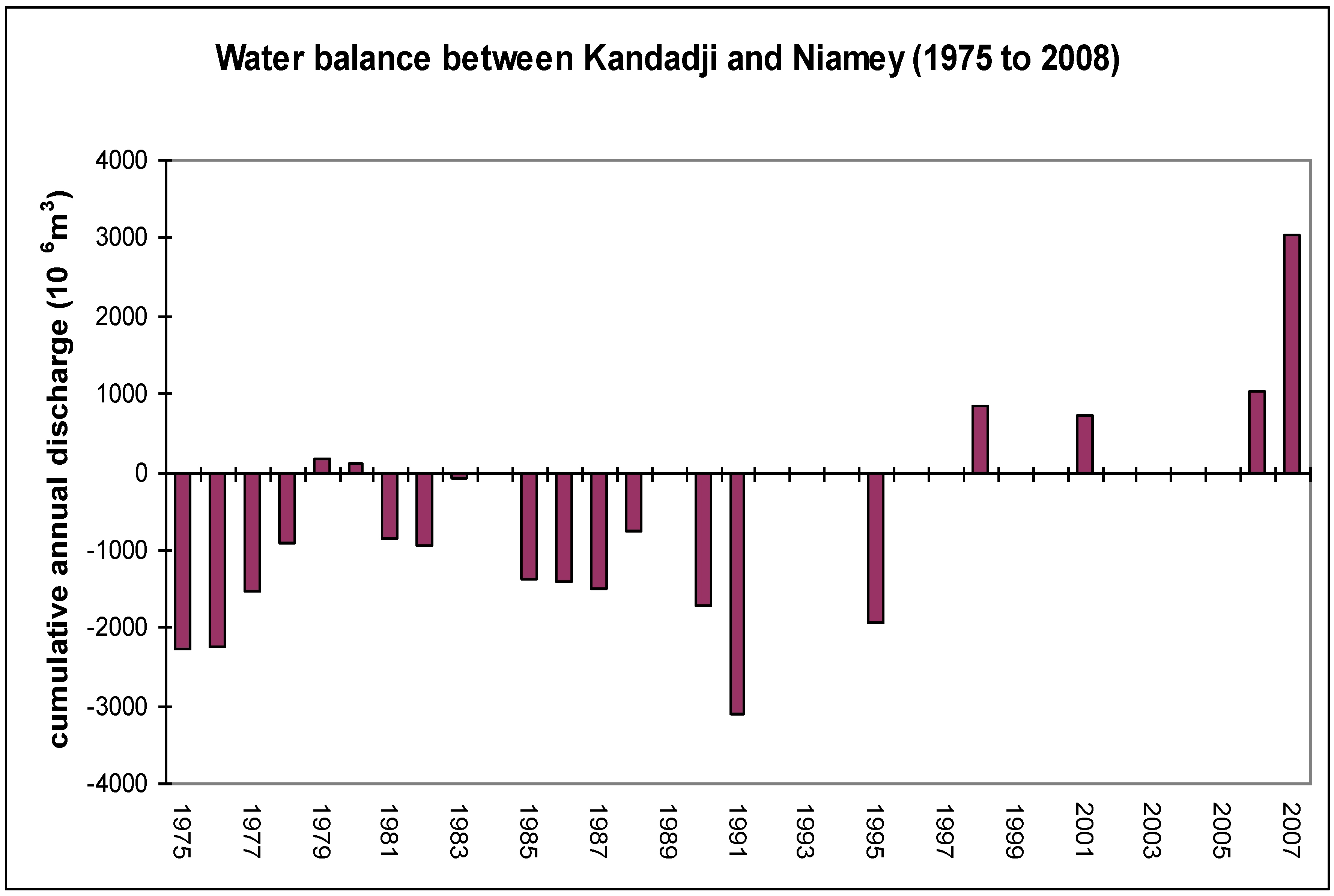 Figure 5 indicates the remaining annual balance of discharges between the two stream gauge stations of Kandadji and Niamey (see location in Figure 3), after removal of the gauged discharges of the two main intermediate tributaries (Dargol and Sirba Rivers). It was observed that, in general, between 1975 and 1996 the input volume was greater than the output volume. Since 1998, for the years with complete discharge data, the reverse has been the case.