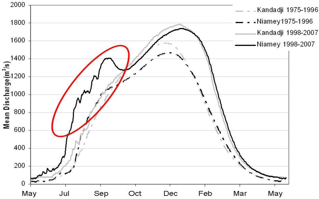 As an example, the basin of Boubon (Figure 4) is one of the newly contributing areas flowing directly in the Niger River bed. Less than 30 of these “koris” (wadi or temporary stream flows) in the stretch between Kandadji and Niamey have become contributors in the two last decades, causing the large increase in River discharge showed in Figure 5.