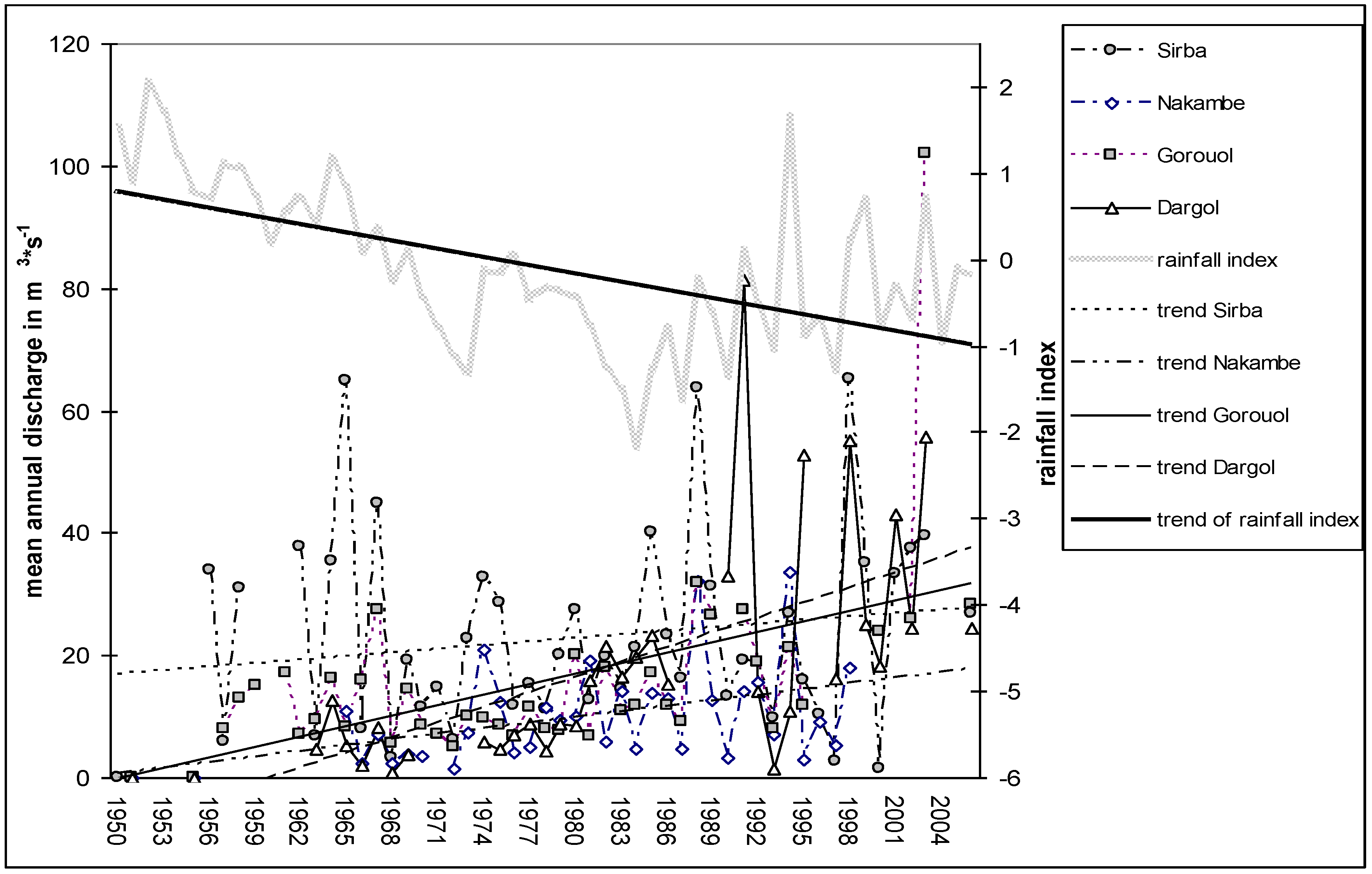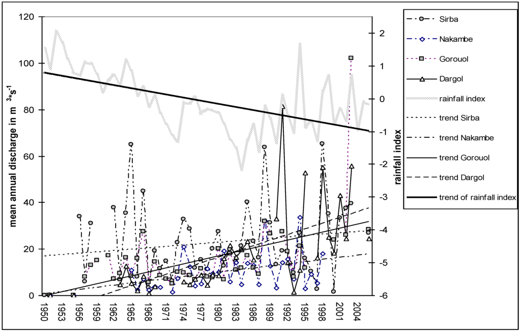 It is well established that for the period of 1970–2000, the decrease in the mean annual discharge of the region’s largest rivers, namely the Senegal and Niger rivers, was in proportion almost twice as much as the decrease in rainfall [1,2]. Similar trends have been observed for smaller river systems [3,4] while, in contrast, other studies have indicated a runoff increase in some Sahelian catchments [5,6,7,8].
