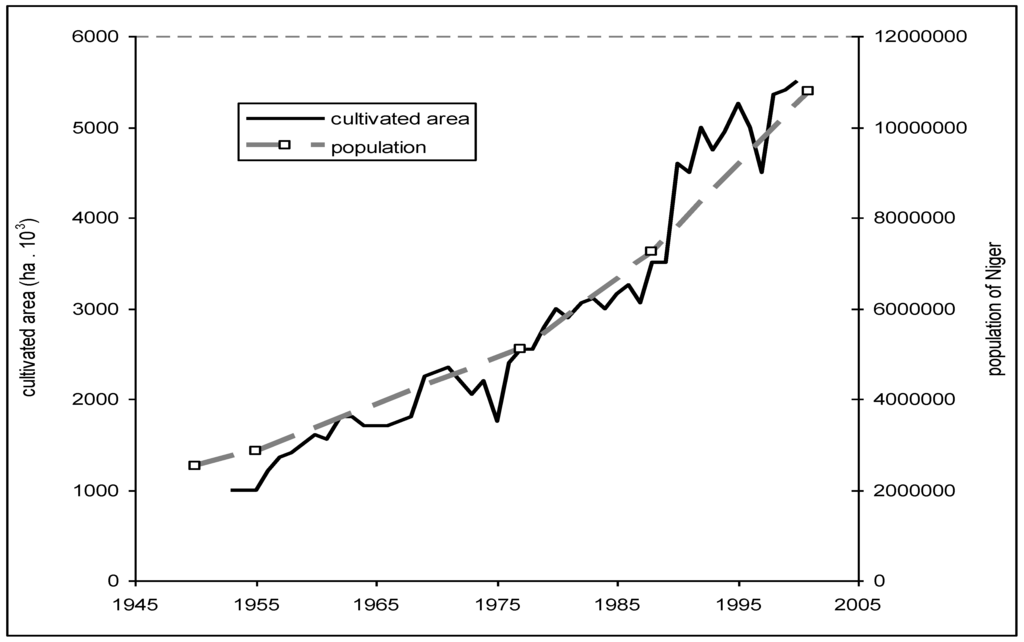 Most of the land cover studies based on aerial photograph analyses show a decrease in vegetation cover throughout the Sahel ([32,33,34,35,36,37] among others). This is corroborated by the official statistical data of cropping areas. For the Niger Republic during the 1999–2006 period, Garba [38] observed a decrease in biomass in a study based on NDVI; but he explains this by the fact that the year 1999–2000 was a humid one. Karambiri et al. [39], Diello et al. [40] and Hauchart [41] also noticed a reduction in vegetation cover in two different regions of Burkina Faso (the Nakambe and Mouhoun basins). Liénou et al. [42] made similar observations in Cameroon, which are consistent with the works of Amani and Nguetora [9], and Mahé et al. [43] on the west bank of the Niger River. Statistical data of the FAO indicated a yearly decrease of 3.7% in the biomass for the Niger Republic, and Hiernaux et al. [44] measured an annual reduction of 2.7% of this biomass in the Fakara (Western Niger).