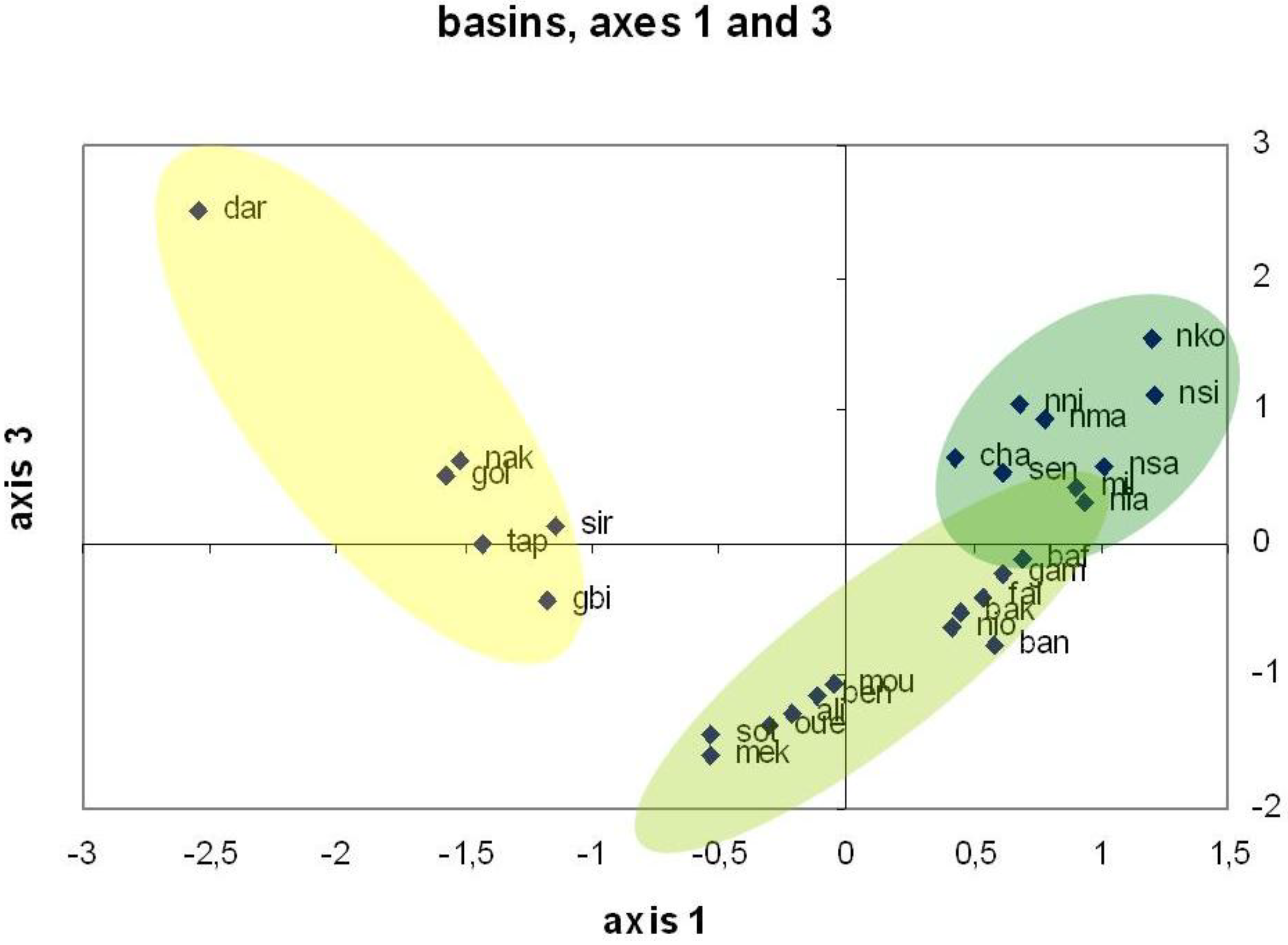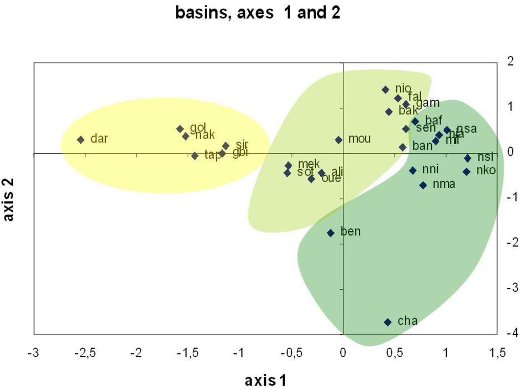 Therefore, it is possible to oppose a «geographical» classification of the basins, this of the PCA analysis (Figure 12 and Figure 13) with a North to South evolution from the Sahelian to the Guinean areas, via the Sudanian, with the hydrological classification, where the Sahel (including the North Sudanian region) is the area where runoff coefficients are increasing, and discharges show in a few cases a slight decrease and mostly a significant increase; then, instead the Sudanian region, the Guinean one is the second area, with a significant decrease in discharges between the two periods, while the Sudanian region, although it is geographically located between the two previous ones, is characterized by the highest discharge decrease rates.