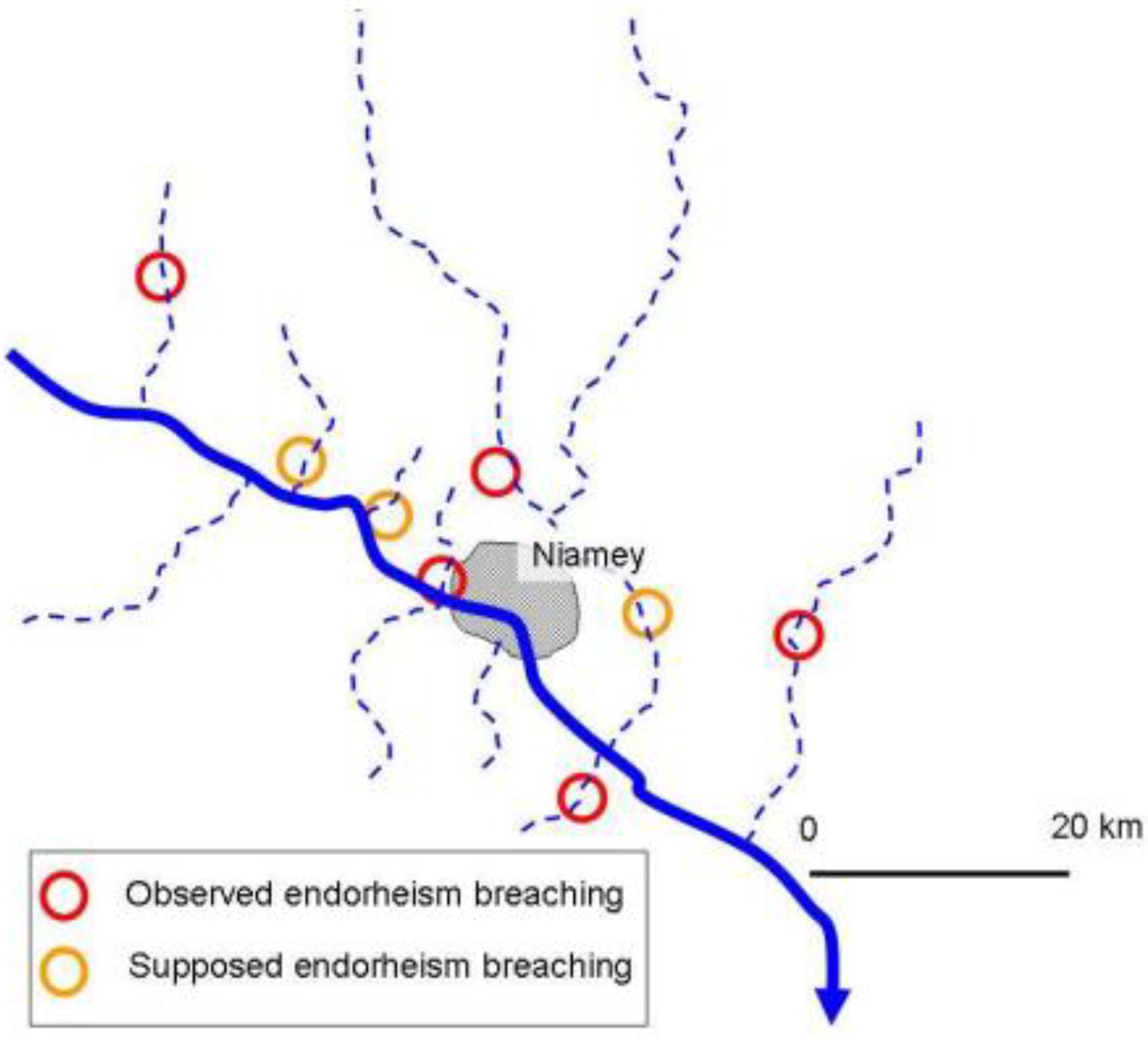 Location of recent endorheism ruptures observed near Niamey, in the middle reach of the Niger River.