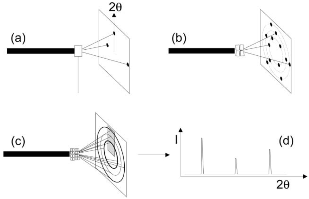 Diffraction from (a) an oriented single crystal, (b) a collection of four crystals and (c) from a polycrystalline material, with (d) the cross-section of the Debye-Scherrer rings ([9]—reproduced by permission of The Royal Society of Chemistry).