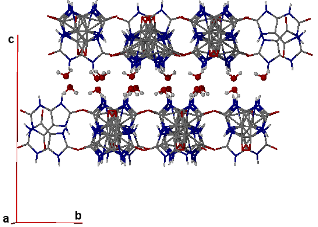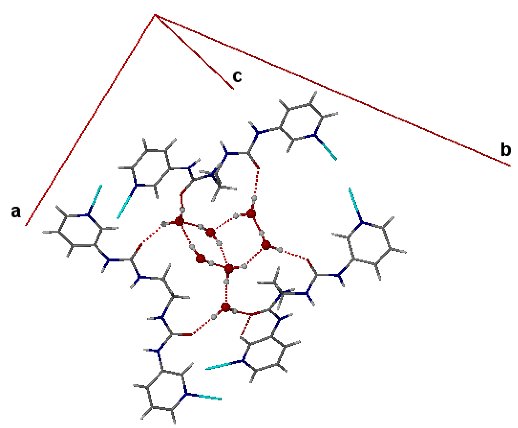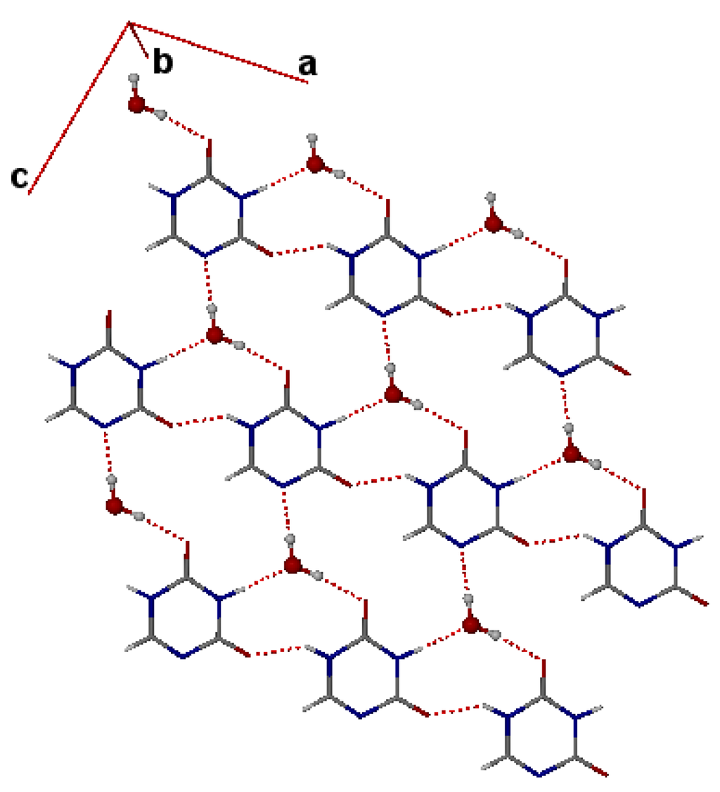 Some hydrates contain the water in discrete layers in the crystal structure, as shown by the example of uric acid dihydrate (Figure 6) [46,47,48]. Although this feature is closely connected to higher guest mobility and thus could be assumed to be most common in non-stoichiometric hydrates, uric acid dihydrate in fact represents a stoichiometric hydrate which undergoes strong pseudomorphosis when dried. 2,2’-dipyridylamine dihydrate also incorporates water as highly hydrogen-bonded network in layers between layers of the host molecules [49]. Although no dehydration studies has been carried out so far, it can be assumed from the extent of hydrogen bonding that this crystal form is also a stoichiometric hydrate.