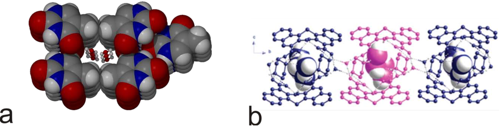 (a) Stacking of thymine monohydrate with the water channels along c and (b) helical structure of the pamoic acid/piperazine co-crystal trihydrate (reprinted with permission from [32], Copyright 2009 American Chemical Society).
