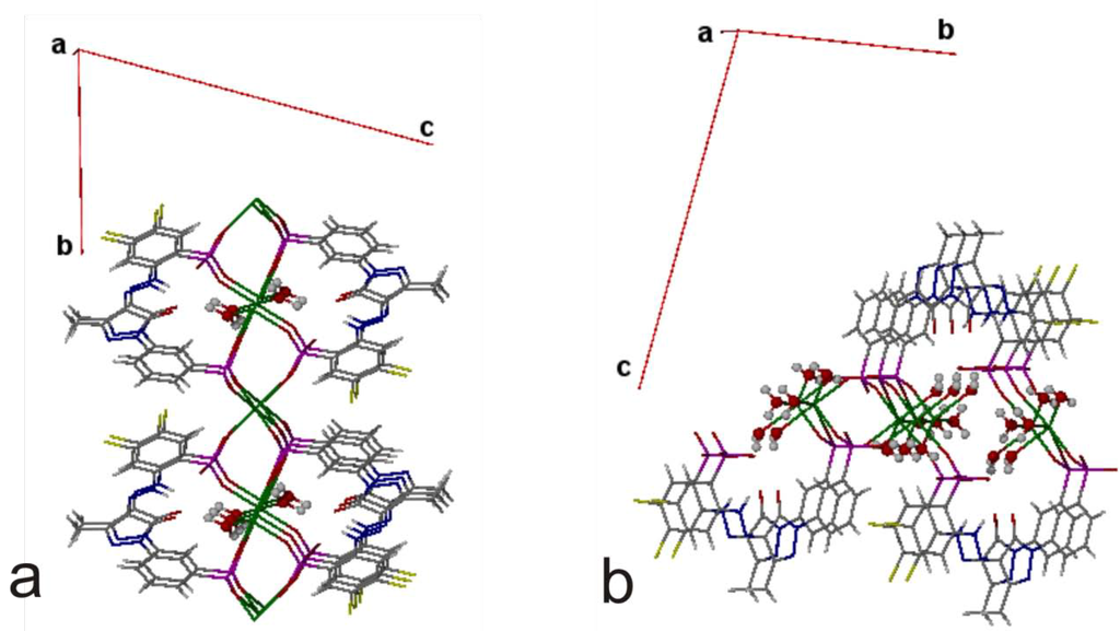 The channel hydrates present another large group of structurally related hydrate crystal forms. They incorporate water in channels or networks of channels throughout the crystal. Depending on the extent of hydrogen bonding and the size of the channels, these hydrates can be either stoichiometric or non-stoichiometric. Thymine forms a monohydrate [33] with the water molecules located in such channels along the c-axis (Figure 5a). Perrier and Byrn investigated the dehydration behaviour of thymine monohydrate and found that the dehydration proceeds along these channels [34]. Since this process is accompanied by pseudomorphosis, i.e., the destruction of the mother crystal into a multi-crystalline powder of the same shape, indicated by the clear single crystal turning opaque, the loss of water is connected with a major change in structure as is characteristic for stoichiometric hydrates. Caffeine 0.8 hydrate [35,36,37] and theophylline monohydrate [38,39] form channels in their structure as well. Both materials are isostructural and stoichiometric, while the water release behaviour from the channels differs significantly [40,41,42]. Another example of a channel hydrate is given in the co-crystal of pamoic acid and piperazine, which forms a trihydrate [32]. Interestingly, two of the water molecules are located in helical channels in the structure (Figure 5b) surrounded by three host helices. The remaining water molecule links the host helices and is situated in isolated sites. The helical water can easily leave the crystal lattice through the channels without the overall structure to collapse, as the authors show by drying and rehydrating. This is a characteristic feature of a non-stoichiometric hydrate. Larger channels are more likely to be a structural feature of non-stoichiometric hydrates, as the water can diffuse more easily through these channels without the general structure changing. Cephalexin dihydrate [43] shows such large channels along the a-axis. The water molecules are mostly disordered indicating already the higher mobility than in caffeine or theophylline. Stephenson et al. [44] proved that this hydrate behaves as a non-stoichiometric material at least for a water content of one to two molecules of water per molecule of cephalexin. Saha and Nangia [45] have described another case of channel hydrate formed by dibromophloroglucinol. Interestingly, the water coordinates in the channels in a hexamer boat type structure which can also be found in hexagonal ice Ih. The authors describe the dehydration as reversible while it cannot be said whether the hydrate is stoichiometric or non-stoichiometric since the rehydration was carried out in a water saturated atmosphere—a condition in which both kinds of hydrates can be rehydrated.