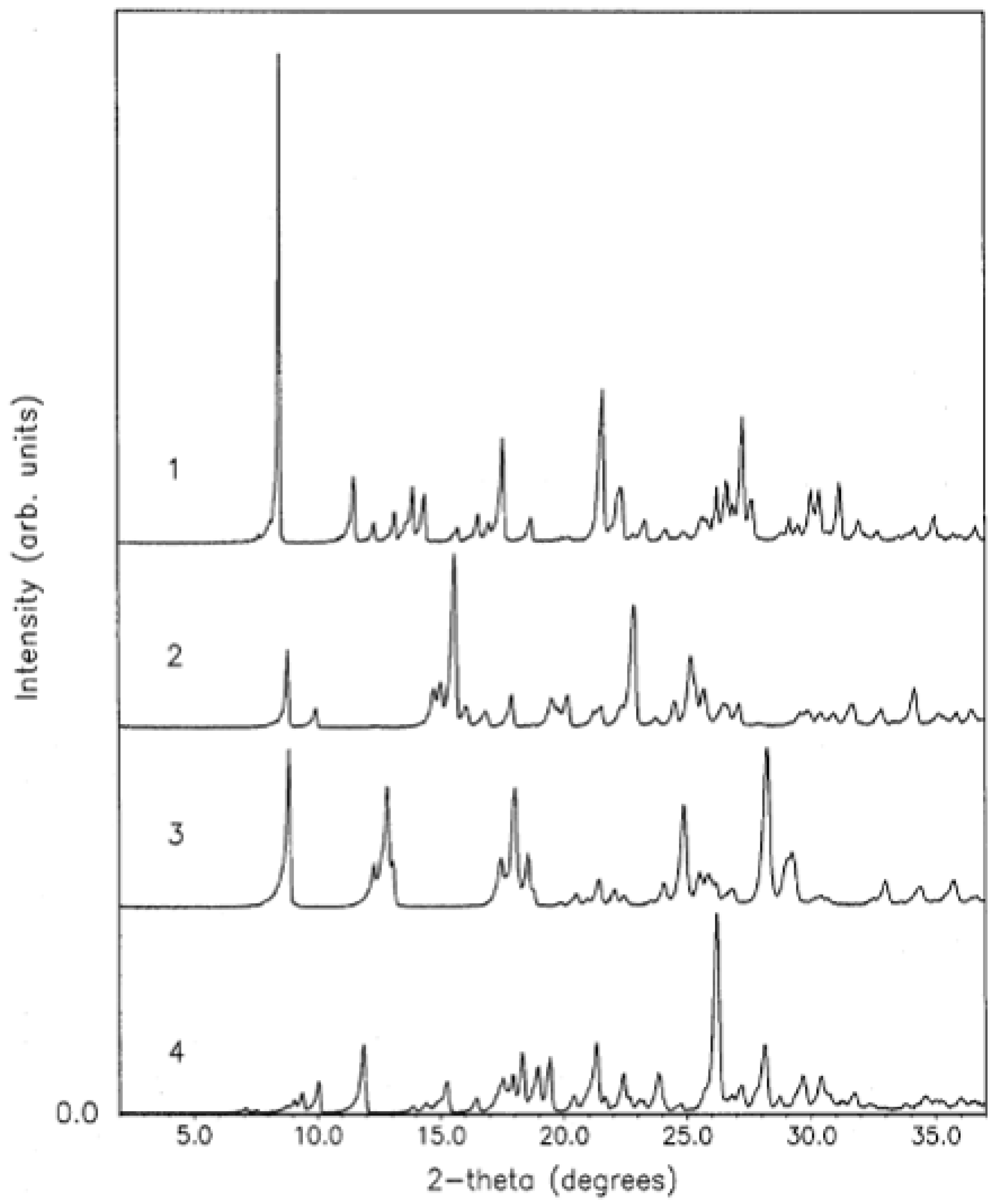 PXRD patterns of piroxicam form I (1), form II (2), form III (3) and the monohydrate (4) (reprinted from [55], Copyright 2003, with permission from Elsevier).
