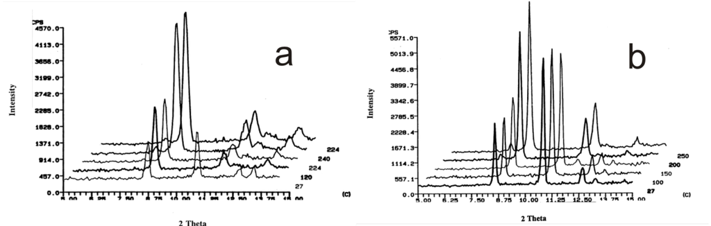 Nedocromil magnesium pentahydrate undergoing the complete transition to the dehydrated form while heated in (a) an open system and (b) a closed system (reprinted from [64], Copyright 2001, with permission from Elsevier).