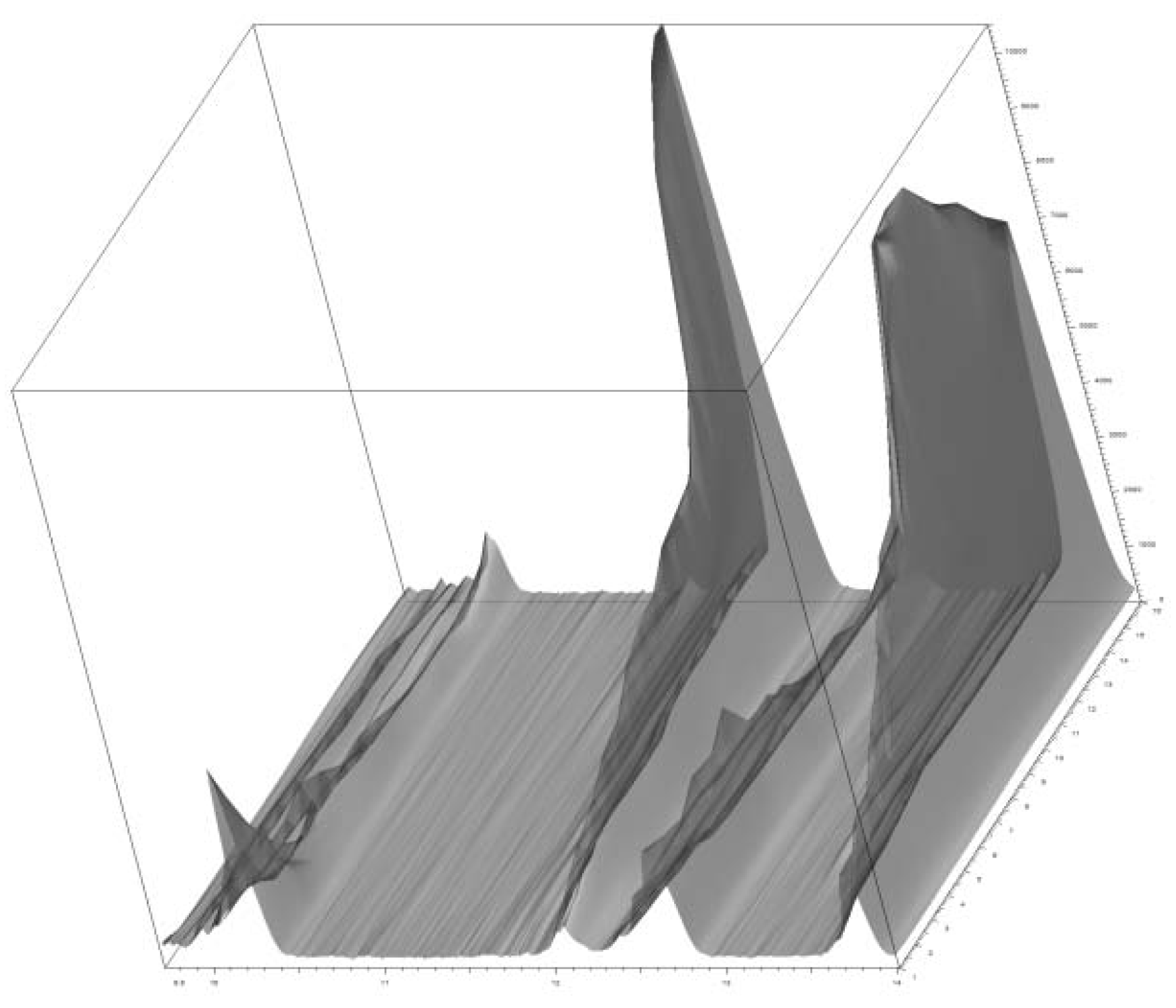 Time-resolved PXRD patterns of orthorhombic paracetamol (form II) at 90% relative humidity, recorded sequentially every 60 min (first pattern in the front).
