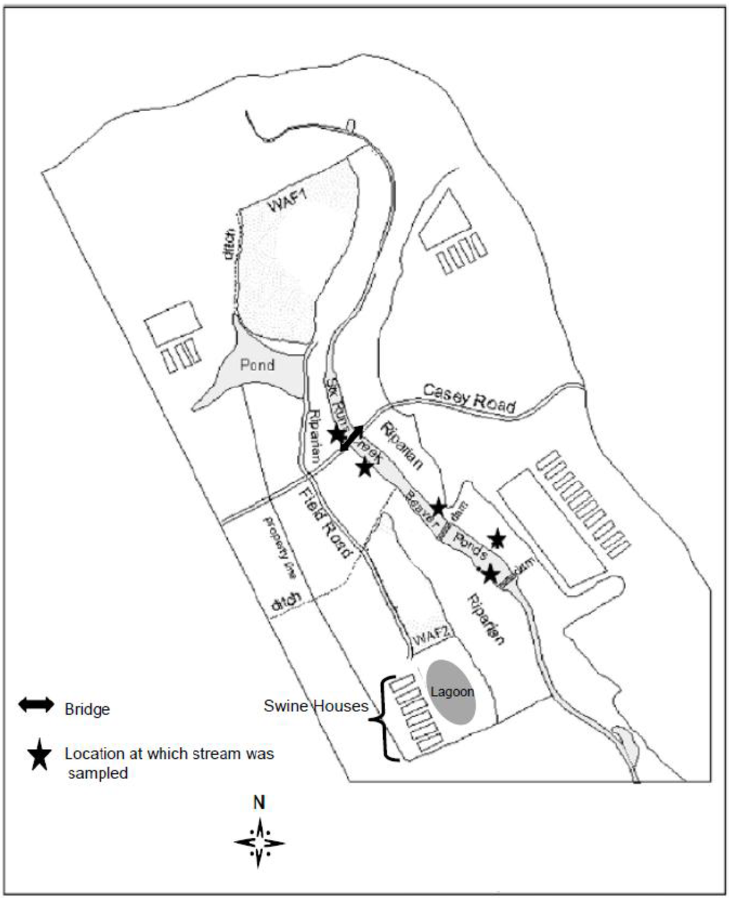 Performance success [21,28,37] coupled with cost effectiveness [38] made ARA a good choice for determining the sources of fecal pollution in a small watershed with few major contributors of fecal pollution. This paper describes the use of ARA to determine sources of E. coli in a segment of Six Runs Creek, located in a small Sampson County, North Carolina, watershed with a high concentration of swine production.