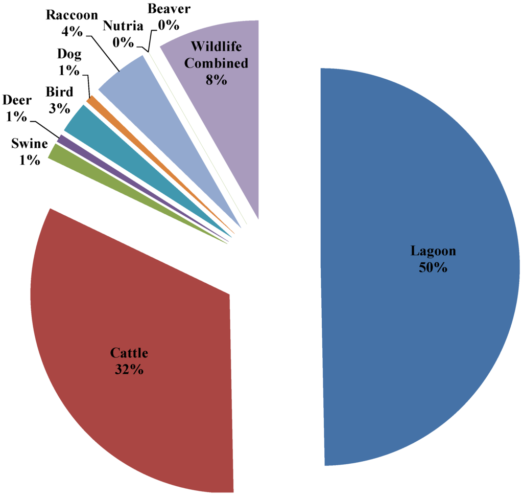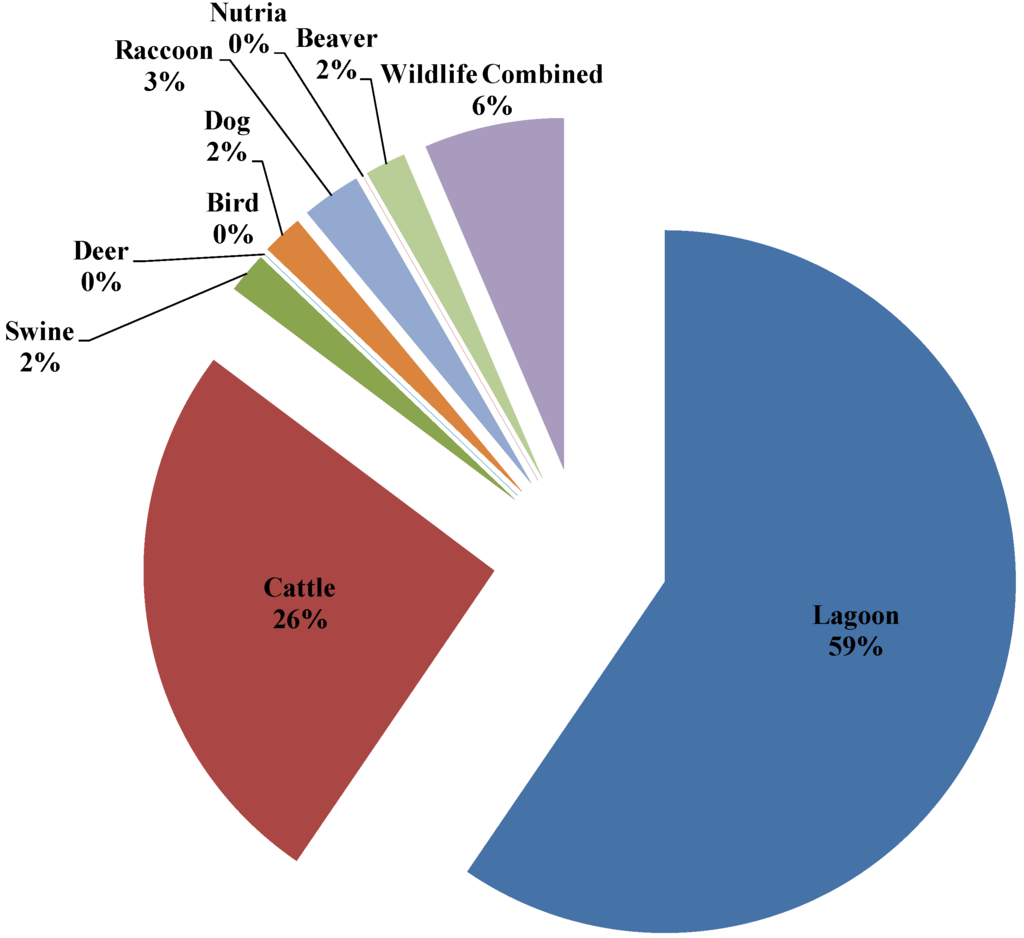 Evaluation of surface water isolates by ARA indicated that lagoon liquid was the predominant source of E. coli in water samples above bridge (63.7%), below bridge (54.2%) and surface water locations adjacent to the application field (66.4%). Olivas and Faulkner [37] identified 48% of E. coli isolates as livestock. Livestock as a predominant source of E. coli in surface water has been a common observation. Studies have reported 47%–52% of E. coli isolates were from livestock sources [21,30,37]. According to Carroll et al. [26] a higher percentage of isolates identified as human (21%–87%) were associated with surface water near residential developments that relied on onsite wastewater treatment systems. Higher percentages of isolates identified as livestock and other animal sources were associated with surface water in less developed areas [26]. Land use patterns and the geographical setting of the present study indicated that the dominant contributor of E. coli would be from livestock sources (swine and cattle). However, flocks of birds were often observed both within the application field and at the water source during some sampling trips. The presence of the beaver dam in the creek indicates that there is a high population of beavers, hence a likely source of bacterial contamination. In the present study, most of the land within the watershed is dedicated for agricultural purposes; fecal loading due to failing onsite wastewater systems was very unlikely due to distances between homes and surfaces waters.
