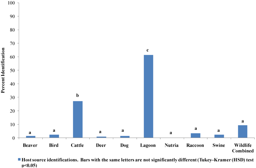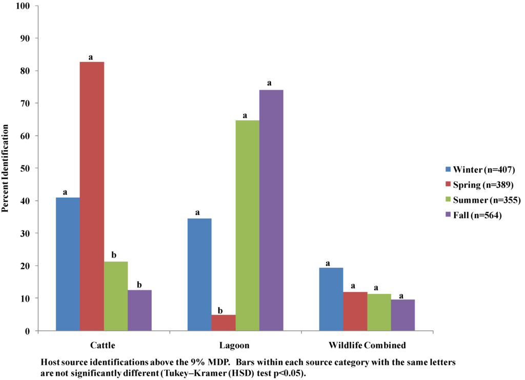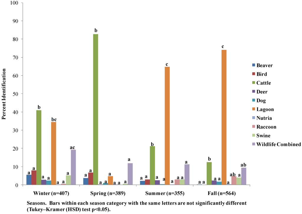 An evaluation of the seasonal characteristics for the host source identifications that occurred above the 9% MDP indicated isolates identified as lagoon liquid (5%) was significantly less than the percentage of isolates identified as lagoon liquid during the other seasons (34%–74%; Figure 7). A significantly greater percentage of isolates identified as cattle occurred during the winter and spring (40%–82%) than in summer and fall (12%–21%). There were no significant differences in the combined wildlife category.