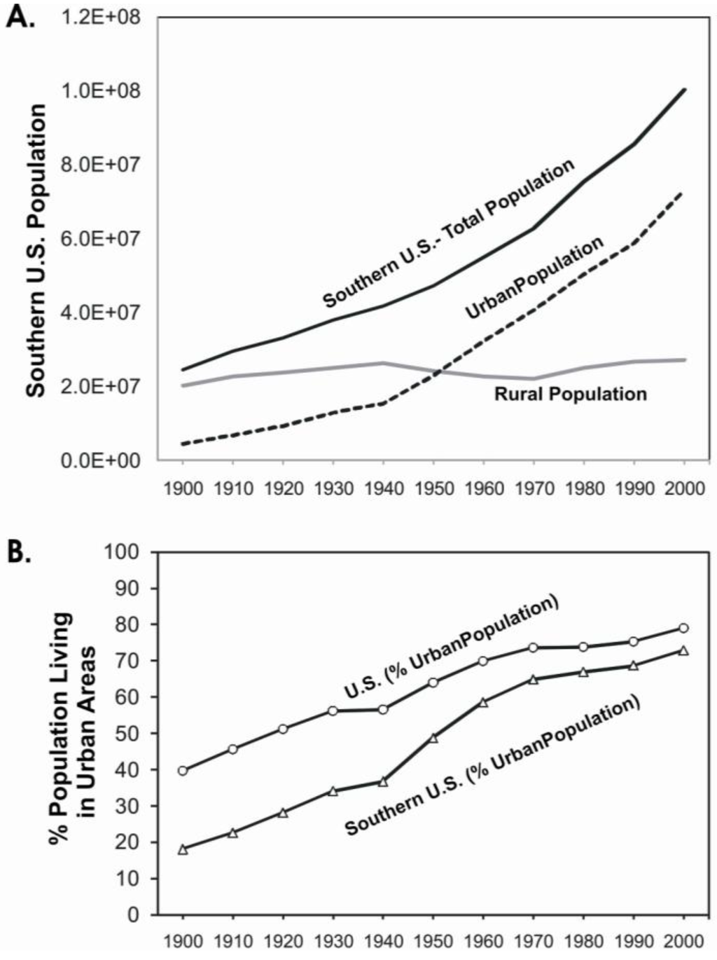 (A) Population change for the period 1900–2000 in the southern U.S. and (B) the percentage of U.S. and southern U.S. population residing in urban areas (source: U.S. Census).