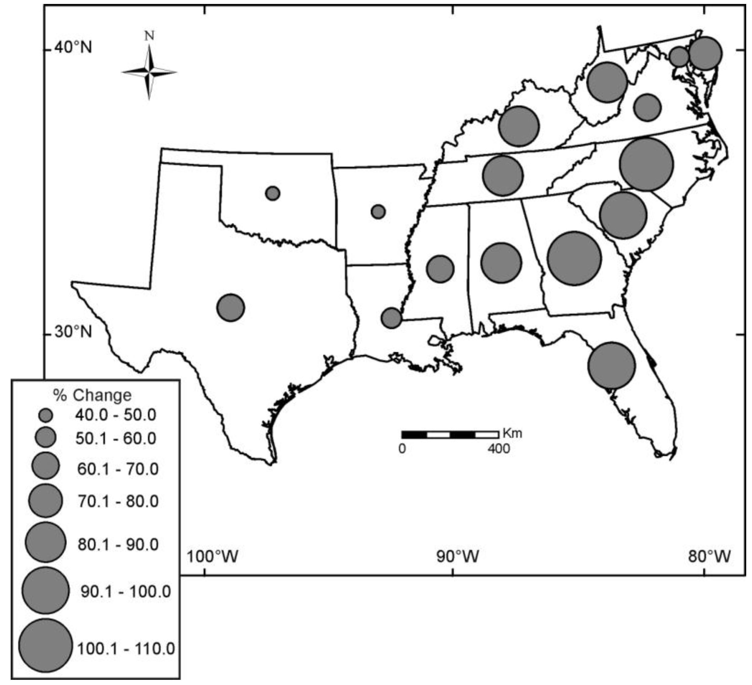 The southern U.S. has experienced large changes in population growth and land use over the last century. Regionally, a large shift of population from rural to urban areas has occurred. For example, in 1900, 18% of the population resided in urban areas but by 2000, urban residents made up 72% of the total population of the southern U.S. (Figure 2). Since the 1940s rapid population growth has been occurring and continues in the region. Most recently (2000–2008), the southern U.S. experienced the largest regional population increase (11.5 million) in the nation [11]. The expanding population in the southern U.S. has resulted in rapid urbanization; from 1982–2007 a 79% increase (21 million acres) in the extent of developed land occurred (based on analysis of urban and transportation networks) [12] (Figure 3). The southern region accounted for more than half of the newly developed land in the contiguous U.S. during the period of 1982–2007 (USDA, 2009). Future projections for the region suggest more extensive urbanization [13] with possibly a 3–4 fold increase in the extent of urban areas over the next 40 years [14].