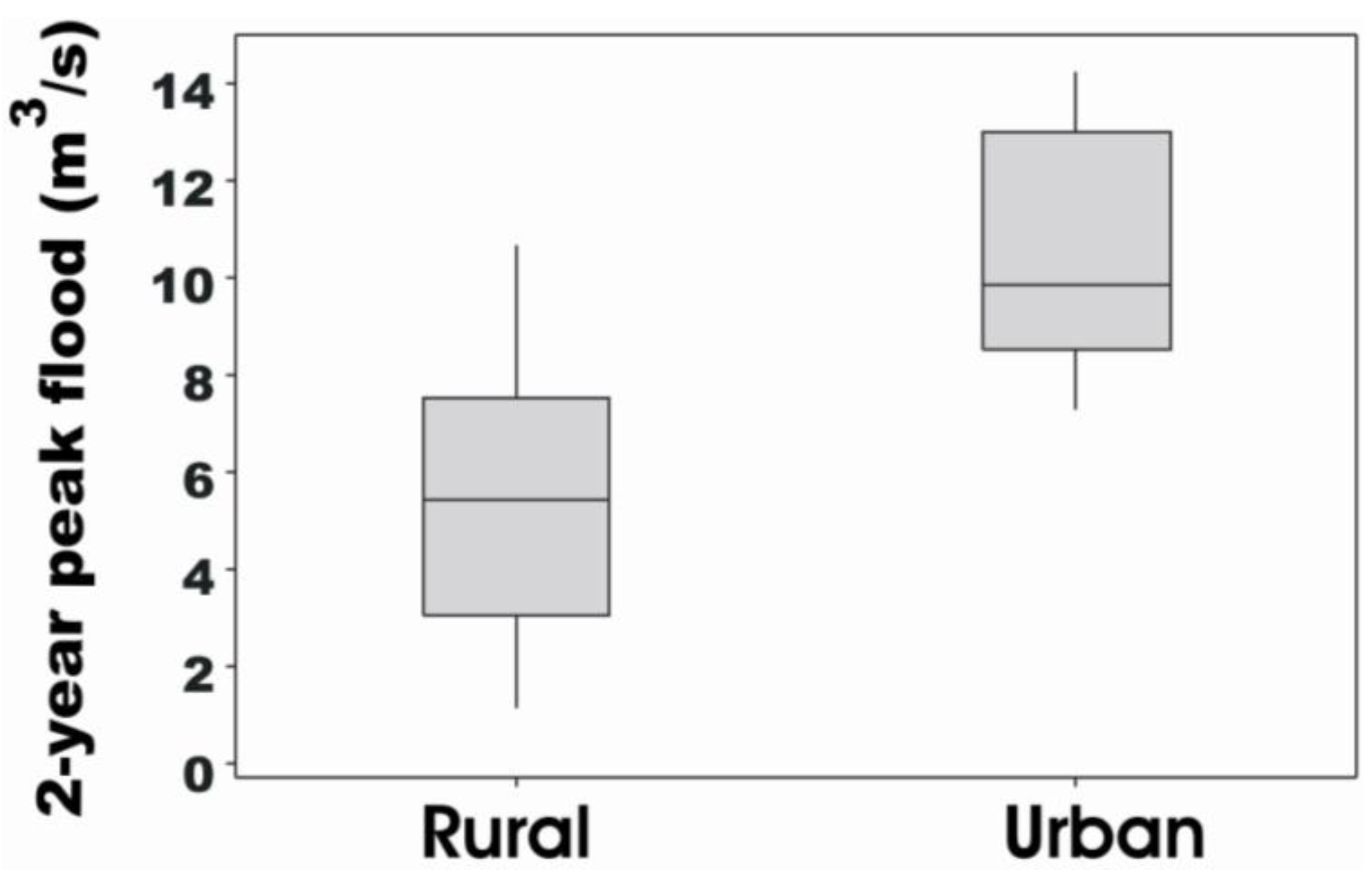 A boxplot (box represents, 25th, 50th, and 75th percentiles) comparison of urban and rural 2 year peak streamflows for 10 small watersheds (1 mi2 or 2.6 km2) in 10 states (AL, DE, FL, GA, KY, LA, NC, SC, TN, TX) within the southern U.S. (using the National Streamflow Statistics Program (Turnipseed and Ries, 2007 )). Simulated watershed impervious area was 25% TIA.
