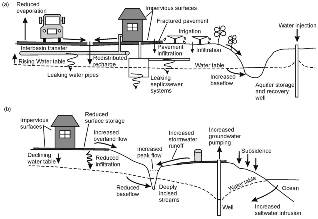 (a) Factors that may contribute to increased groundwater recharge and/or increased baseflow in urban settings. (b) Factors that may contribute to decreased groundwater recharge and/or decreased baseflow in urban settings (Modified from Welty et al. 2007) [22].