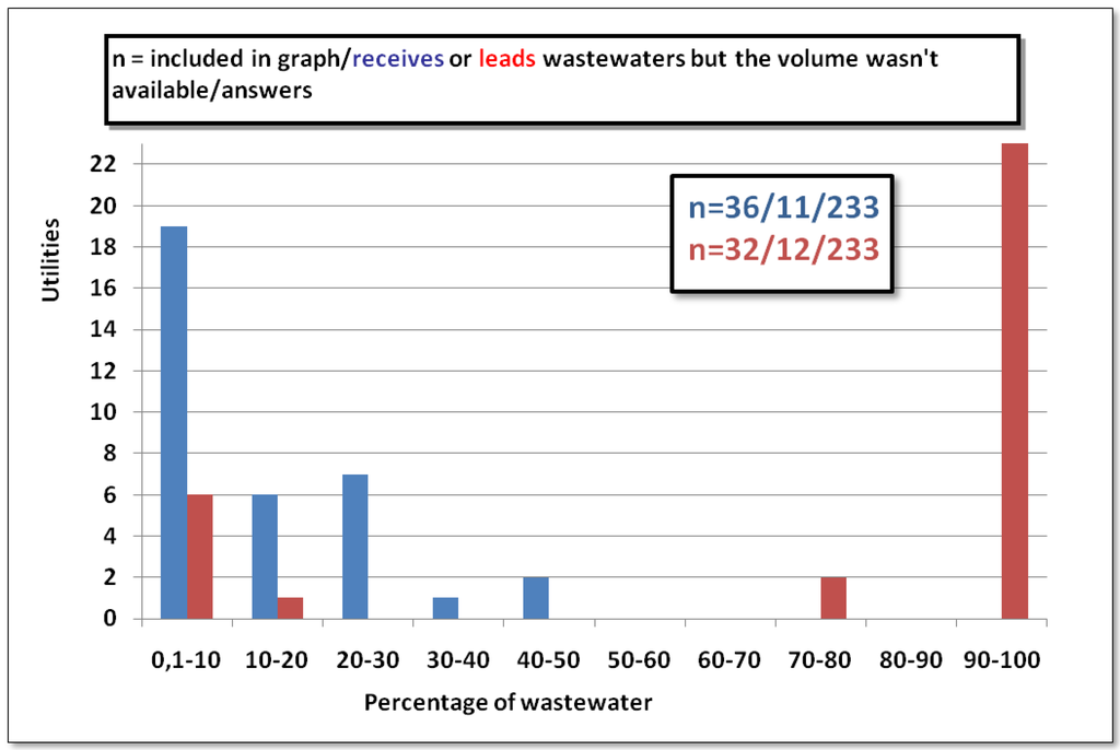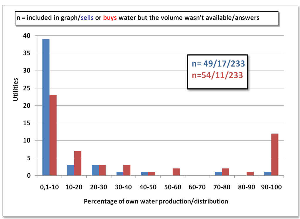 It is common for bigger cities and utilities to make bilateral contracts with several utilities. One utility may enter into as many as 10 bilateral contracts. It is worth noting that the percentage of bought raw water is either very low or very high. The share of wastewater with other municipalities is also either very low or very high. (Figure 1 and Figure 2)