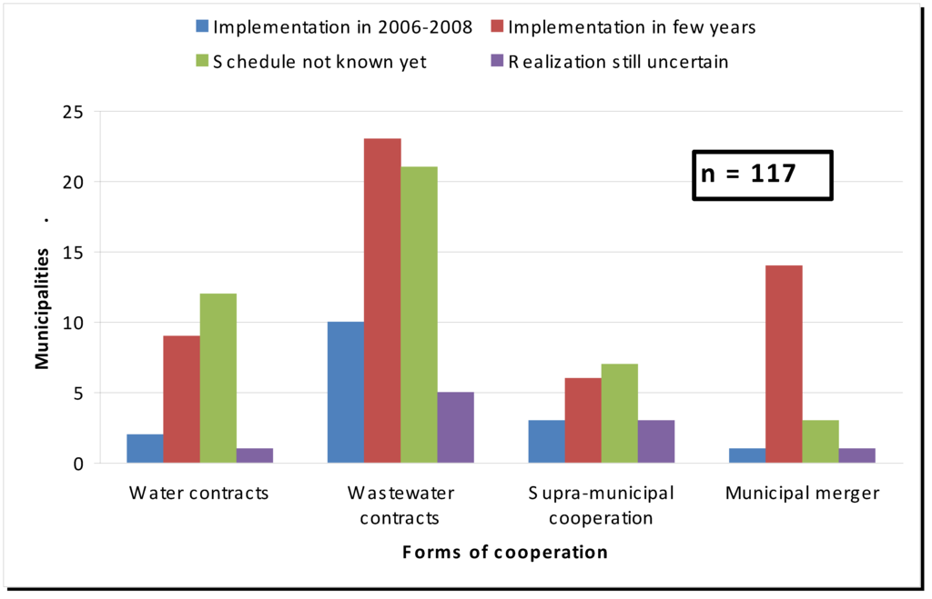 It seems that both contractual and closer forms of cooperation will increase in the future. Of the 233 utilities, 117 had plans for some kind of future supra-municipal cooperation. Many of these plans (59) involved wastewater contracts (Figure 3).