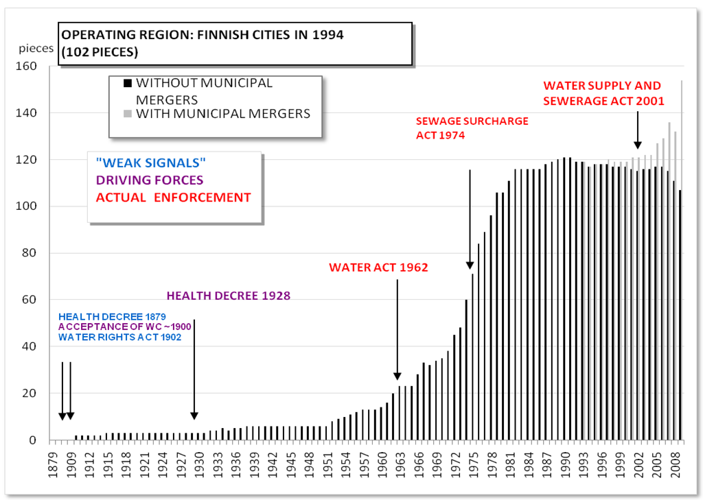 Finland has gone through several periods of extensive municipal mergers in 1944–1947, 1966–1977 and 2000–2010. In 1944 the number of municipalities was 603, which by 1947 decreased to 547, by 1977 to 464, and finally to 342 in 2010 [2]. These mergers affected the way water and wastewater services are managed. Water and sewage utilities, for their part, have also promoted other types of supra-municipal collaboration.