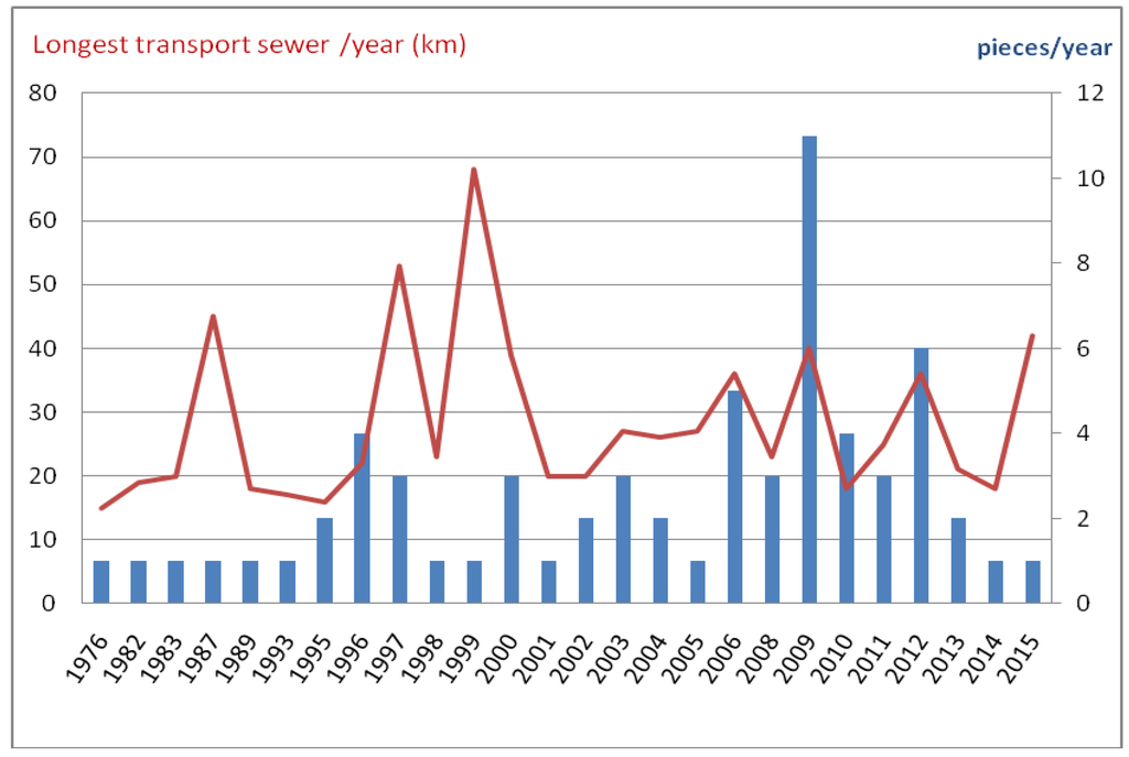 Number of supra-municipal transfer sewers over 15 km constructed and the longest constructed each year [4].