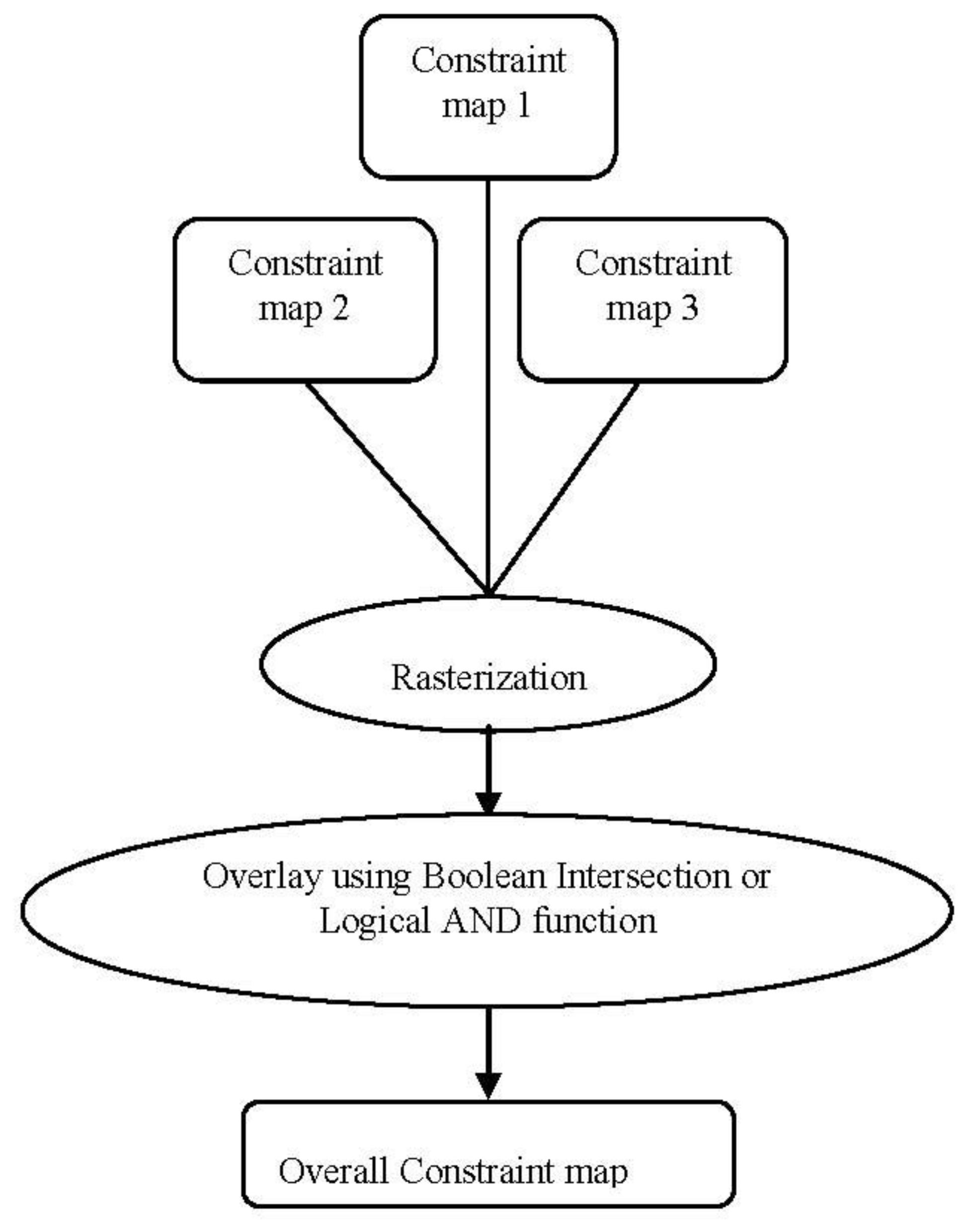 After reducing the constraint maps to Boolean images, all the layers were assigned an equal weight as they were considered to be equally important. The Boolean images were subsequently overlaid consecutively; by using the Boolean Intersection or Logical AND technique available in the Multi-criteria Evaluation (MCE) module of the IDRISI