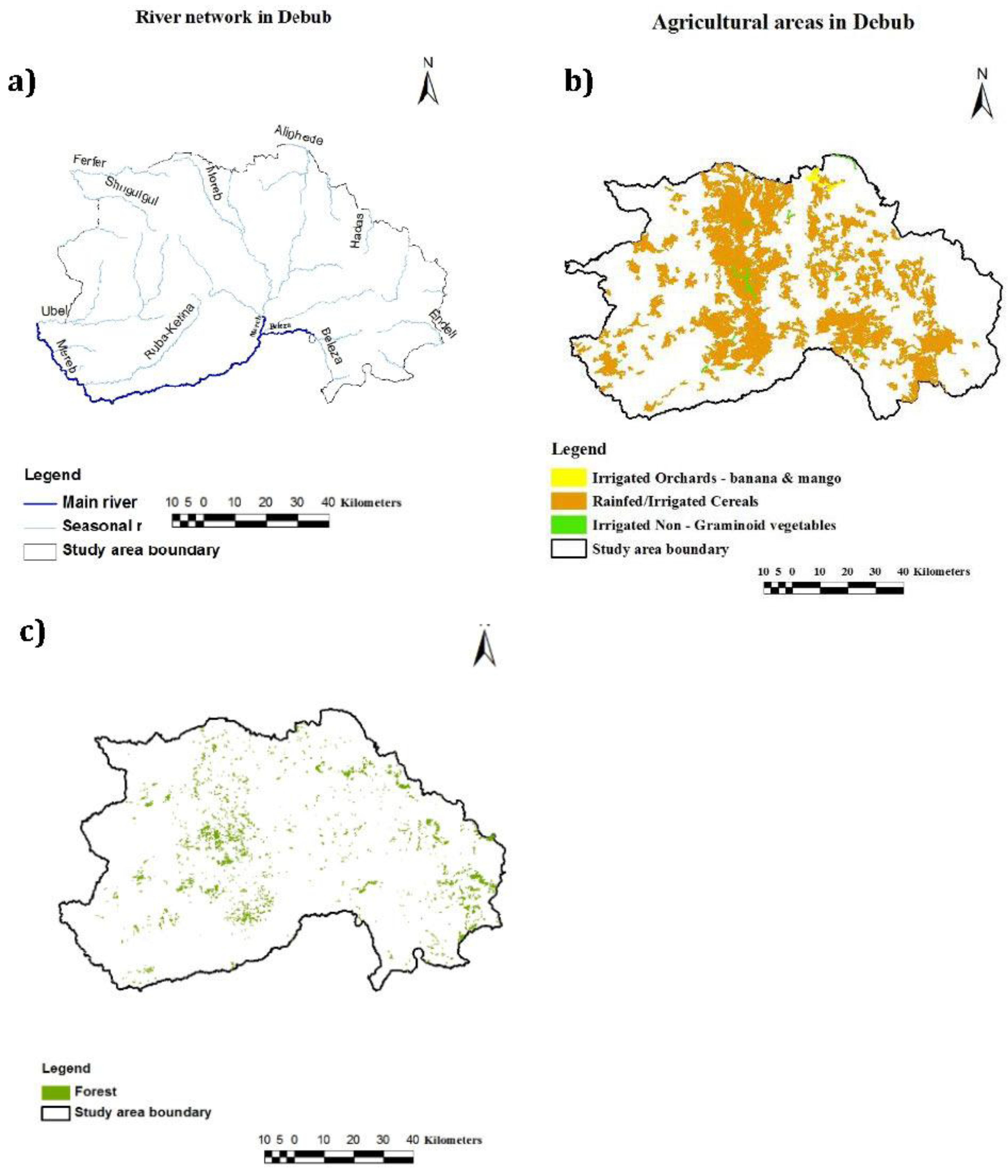 Figure 3a) was therefore used as a constraint. An index value of “1” was assigned to areas through which rivers in Debub pass, hence suitable for constructing a reservoir, whilst the other areas, considered to be unsuitable, were assigned an index value of “0”.