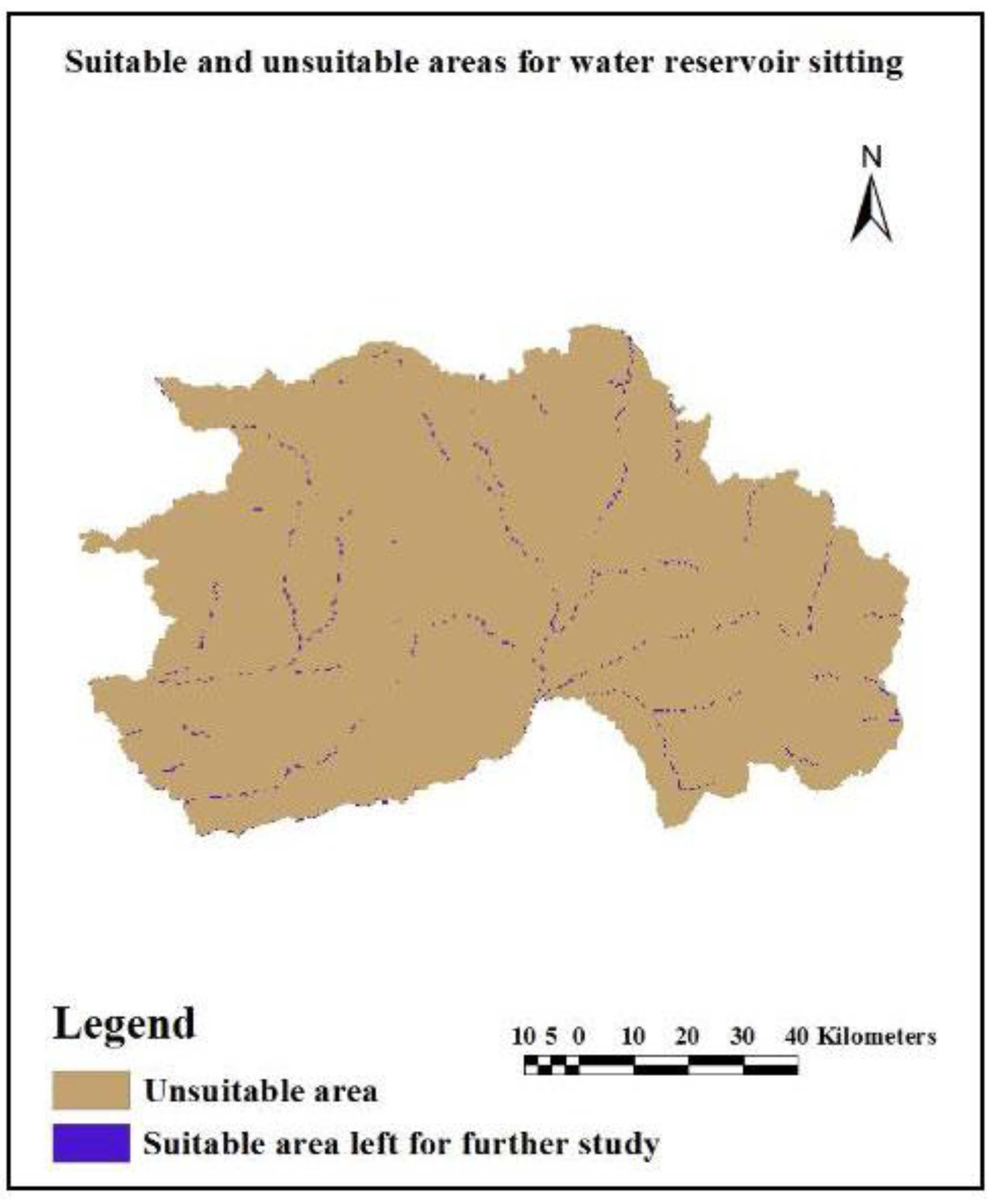 This stage involved utilizing exclusionary criteria (also known as constraints) in preliminary screening to exclude unacceptable areas for siting a water reservoir. These areas are locations where due to environmental and hydrological concerns were rejected for the purpose of siting a water reservoir. A diagrammatic representation of the steps taken to accomplish this first-stage is shown in