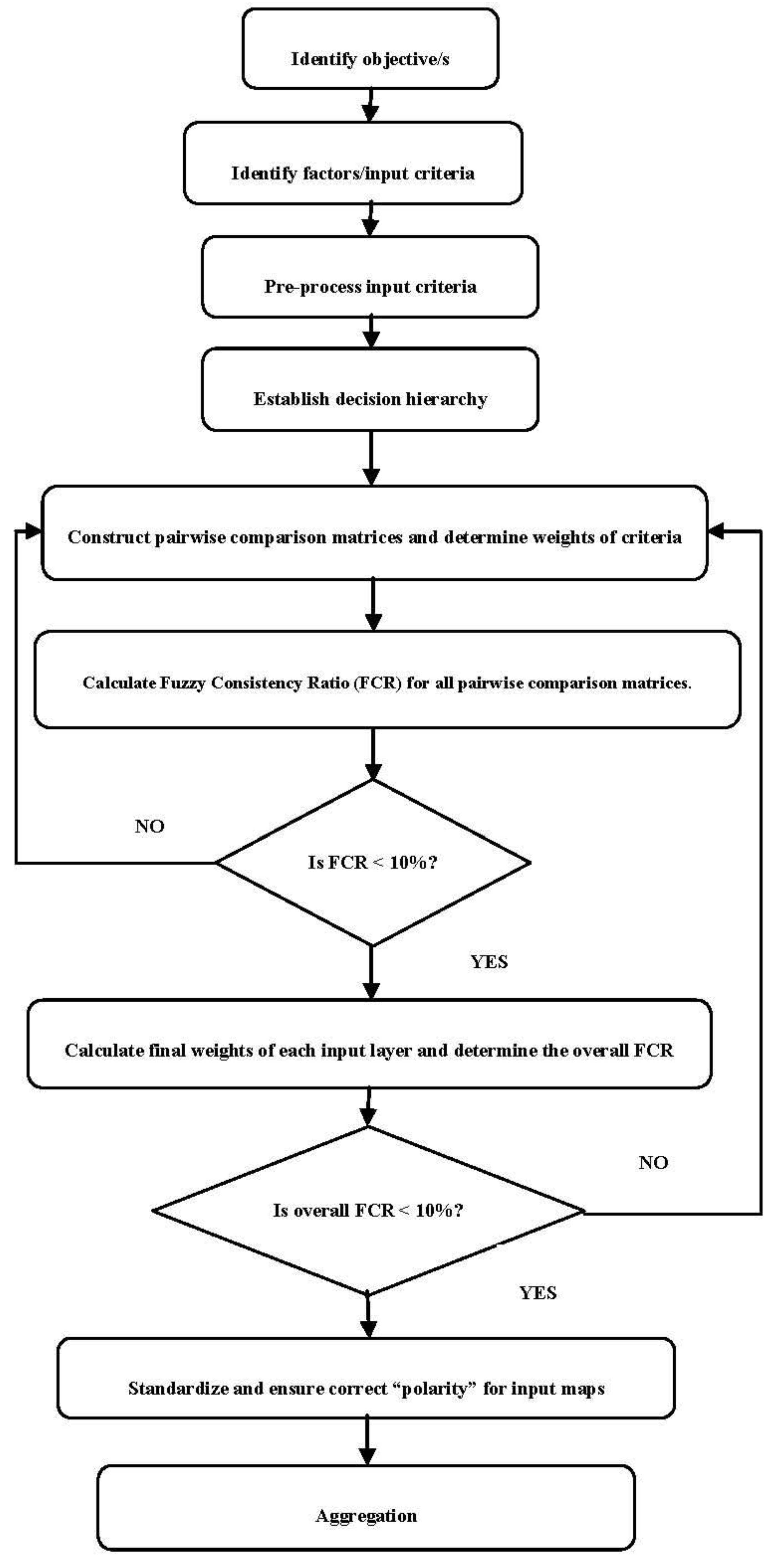 After collecting the above mentioned datasets, the methodology of this study was divided into a two-stage process. The first stage involved utilizing the most simplistic type of data aggregation techniques known as Boolean Intersection or logical AND to identify areas restricted by environmental and hydrological constraints and therefore excluded from further study. The second stage involved integrating fuzzy logic with the Analytic Hierarchy Process (AHP) to identify candidate water reservoir sites in the area designated for further study.