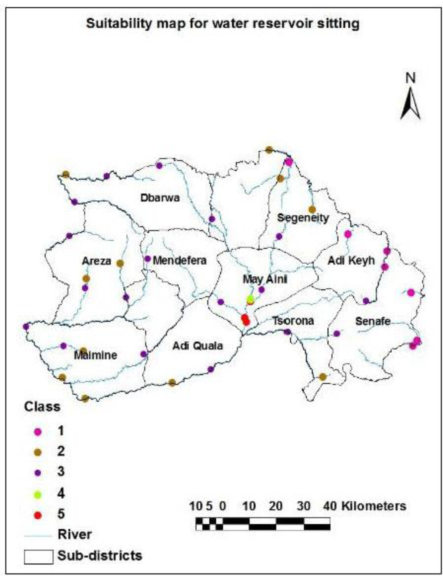 The final output of Equation 21 was a map showing a number of suitable sites for locating water reservoirs in classes 1 to 5.