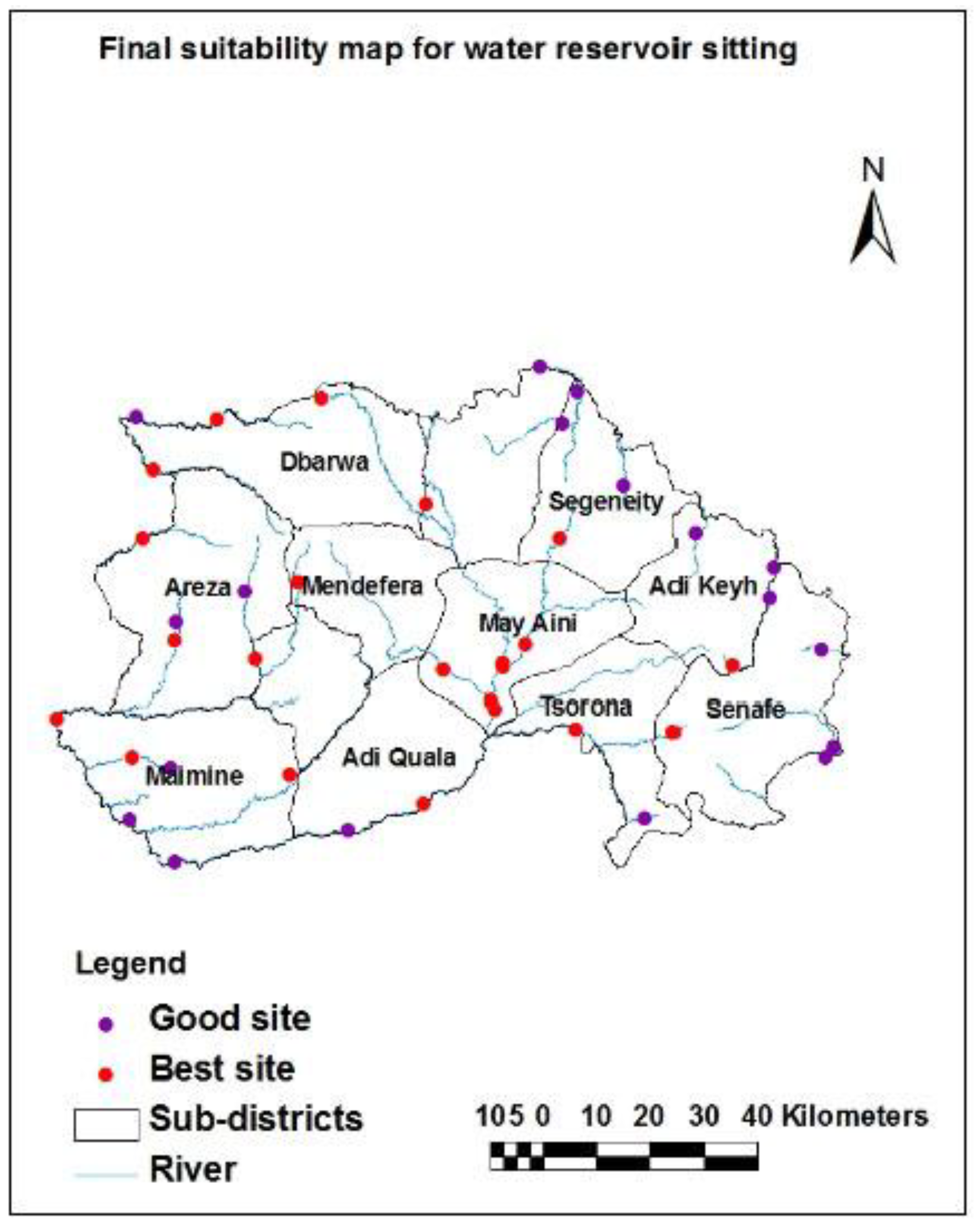 Following sensitivity analysis, sites in classes 5, 4 and 3 were then grouped together and considered to be the best, whilst those in classes 2 and 1 were considered as the good sites. The result was a map with sites divided into 2 discrete categories: best water reservoir sites and good water reservoir sites. In addition to the criteria and constraints used in identifying candidate sites, reservoir siting is also affected by the volume of water that can be stored at a particular location. To get the volume of water that can be stored at a site, the methodology described by [