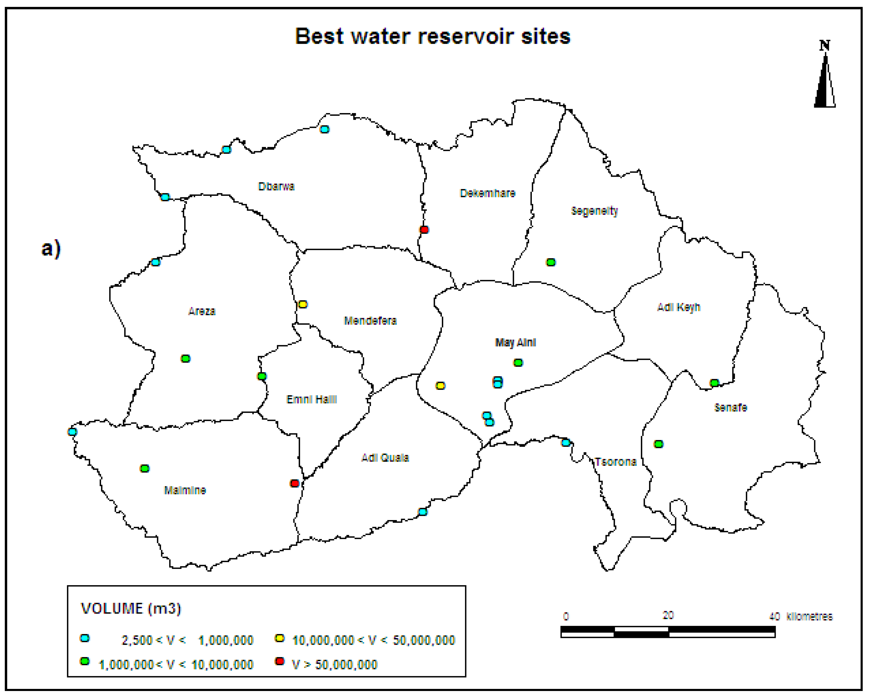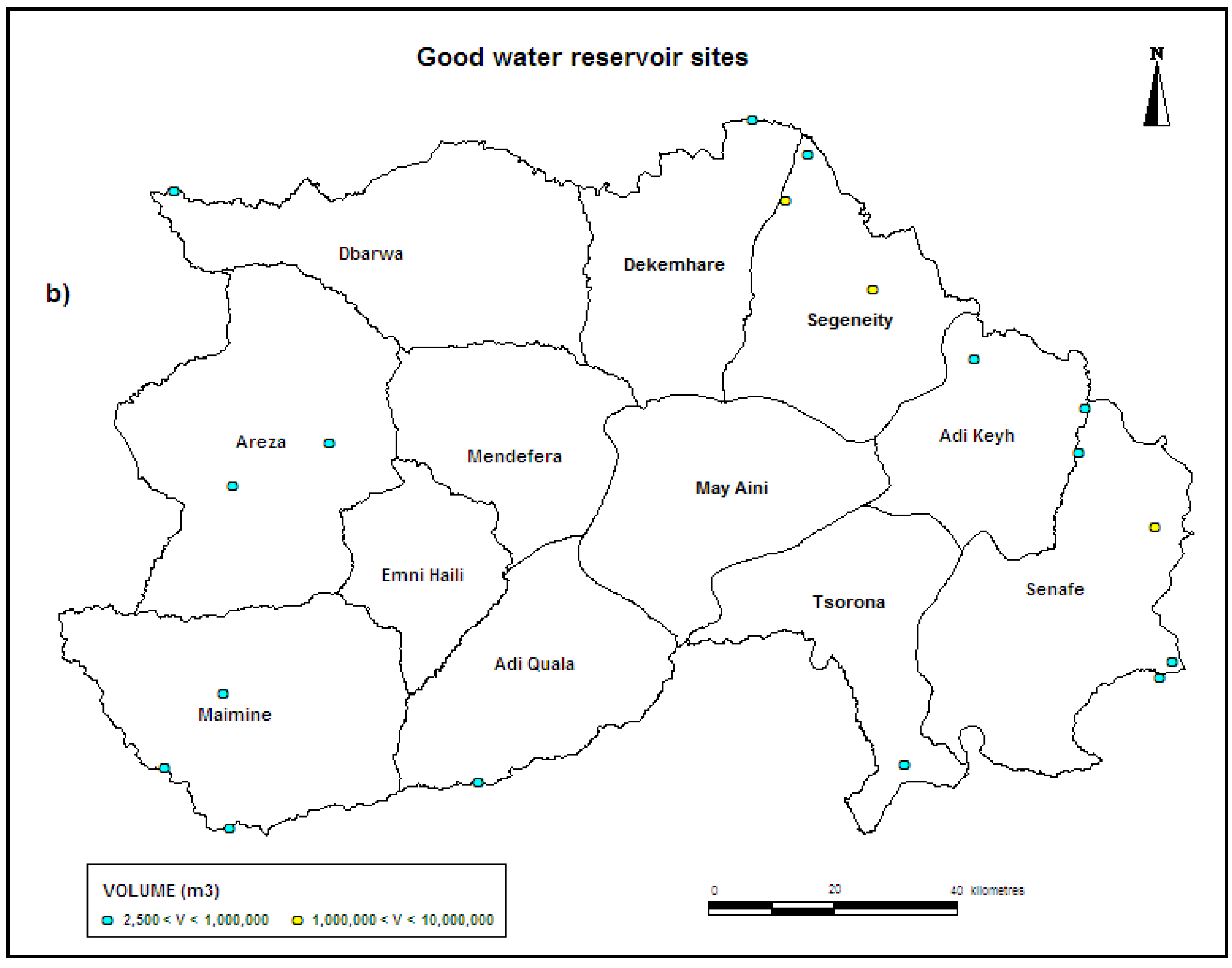 Figure 10, with sites divided into 2 discrete categories: best water reservoir sites and good water reservoir sites. However, selection of suitable water reservoir sites is also affected by the volume of water they can store. The methodology described by [