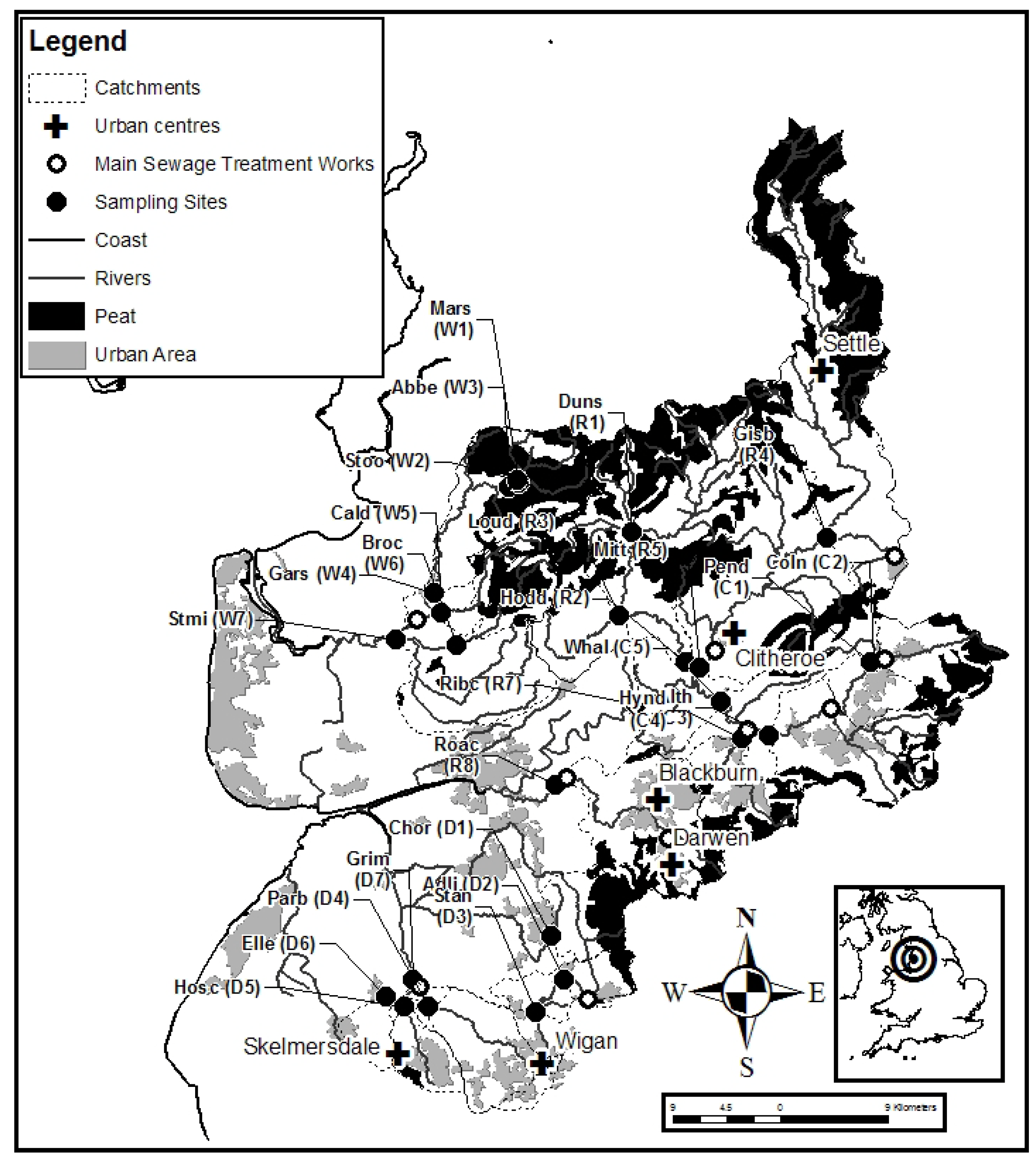 The major rivers of the Ribble and Wyre drain to the Irish Sea and both have upland areas of outstanding natural beauty. While the Wyre has only one market town (Garstang) in its lower reaches, the Ribble drains many of the major urban/industrial town of northeast Lancashire (Burnley, Accrington, Blackburn and Wigan). The geology of the Ribble (including the Calder 1,152 km2) is predominantly carboniferous age limestone, shale and grit of the Yorkshire Dales and the Trough of Bowland. For the other river basins of the Wyre (314 km2), Calder and Douglas (231 km2), the underlying geology is shale, grit and sandstone. Across the Ribble and Wyre basins, 26 sites were monitored to cover a wide range of catchment typologies and gradients. Figure 1 provides a map of the study area and the location of the sampling points. Details of the sites, grid references and average values for some basic chemical parameters may be found in Table 1.