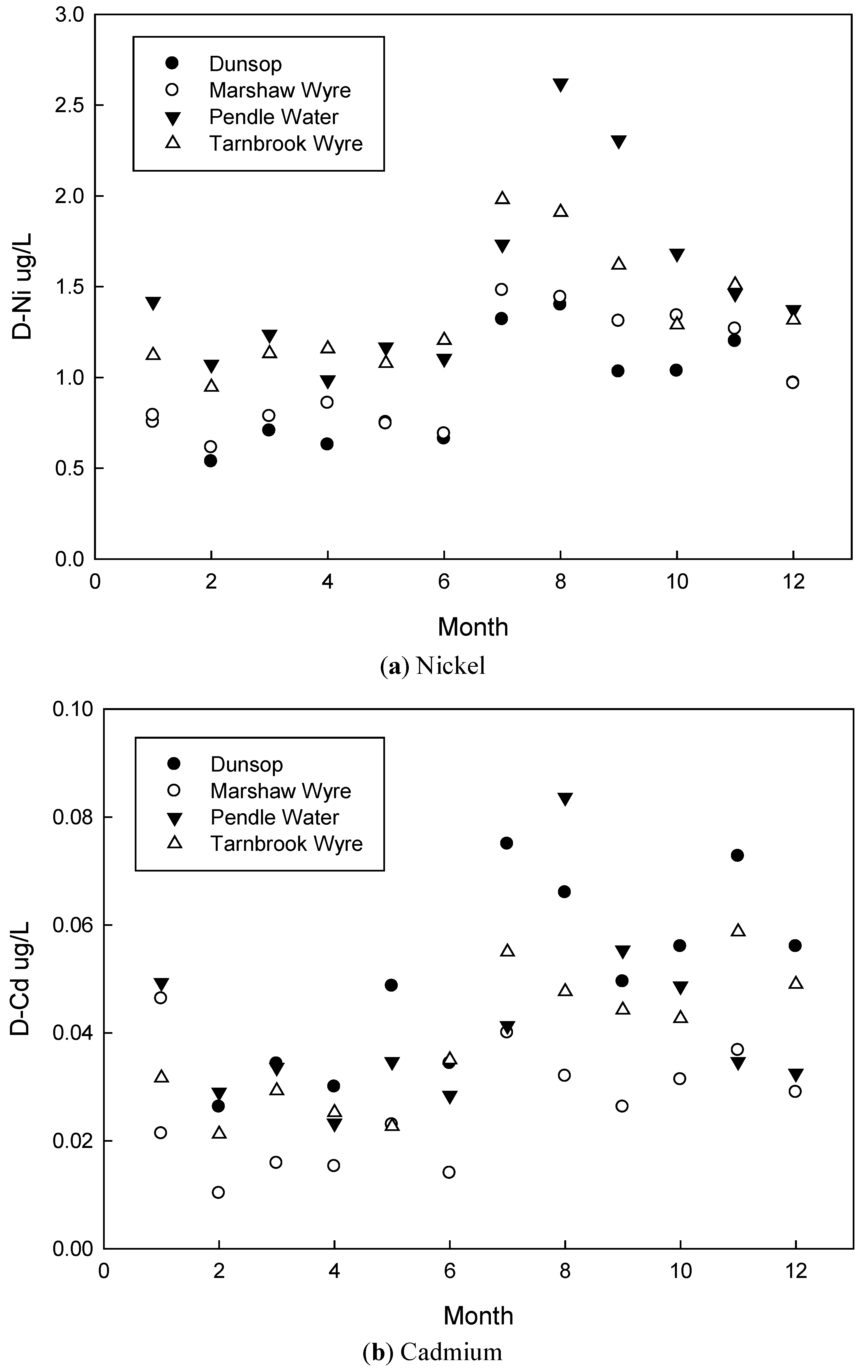The current study presents a picture of low [D-Ni], [D-Cd] and [D-Pb], which may be attributable to a lower contribution from the atmosphere due to the use of lead-free petrol and the reduction in the combustion of coal for energy generation, good control discharges from sewage treatment plants, and small amounts migrating into the river from agricultural systems. These reliable estimates of annual averages and maximum values demonstrate that for these three priority substances identified for the Water Framework Directive, the rivers are of good quality with regard to chemical status. Dissolved cadmium and lead exhibit similar behavior to each other, whilst dissolved Ni is more mobile and retained less in the upland peat and the sewage treatment plants. Good quality analytical data is required for the further development of RBMPs and to facilitate the achievements of good environmental status in surface water bodies.