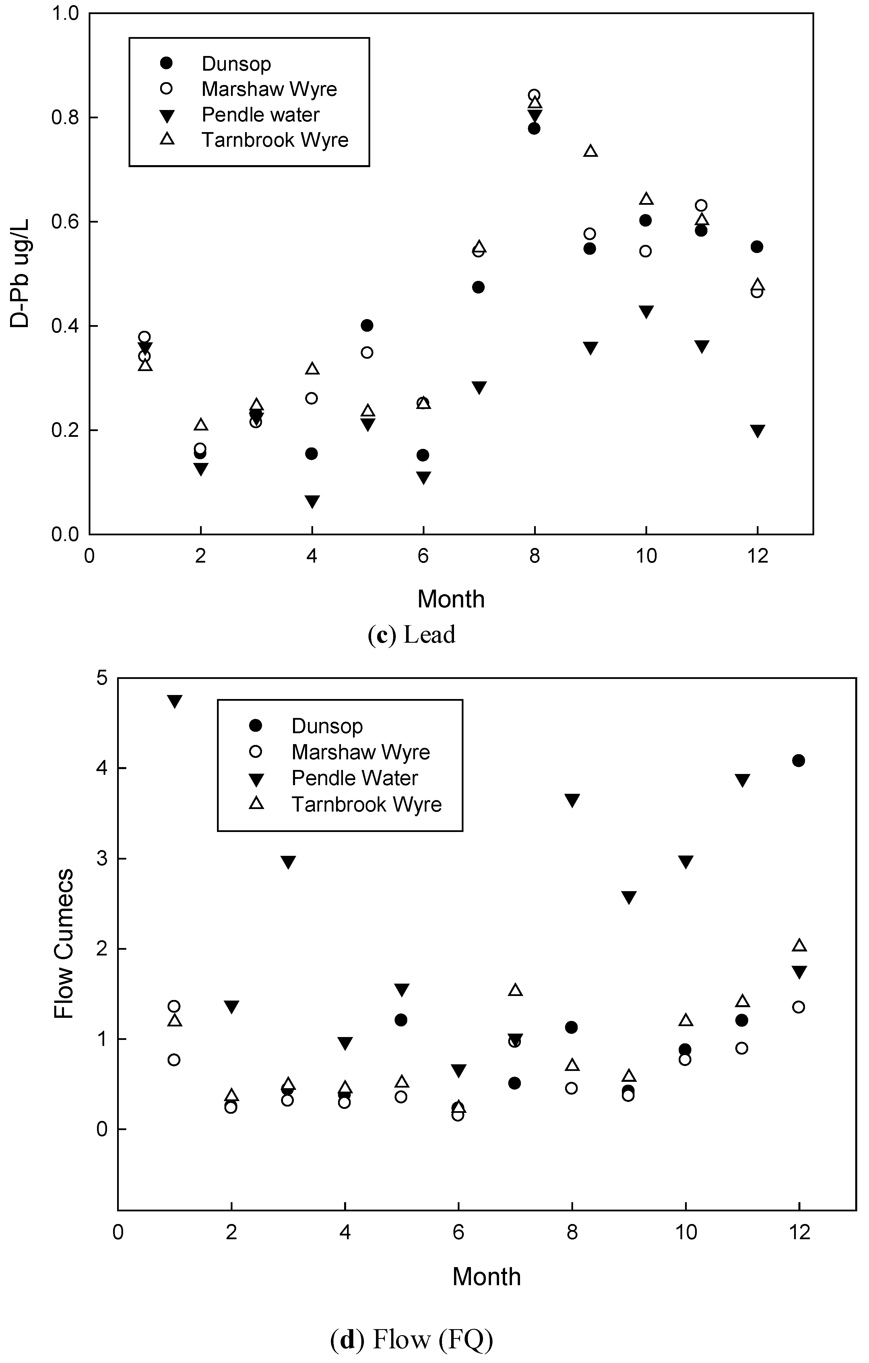 For the extensive agricultural landscape of the Wyre the cycling of the trace metals relates mainly to diffuse inputs. Although there is no relationship of stream flow with trace metal concentrations, for [D-Cd] and [D-Pb] high flow concentrations are respectively two and three times the low flow concentrations. There is a similar two fold high flow enhancement for [D-Ni] in the Wyre. However, concentrations remain low and of little environmental consequence. Similar patterns for base and storms flow concentrations were reported for the Humber catchments [13]. For [D-Ni] the combination of the inputs from atmospheric, diffuse and point source inputs presents itself as an unclear pattern across the catchments.