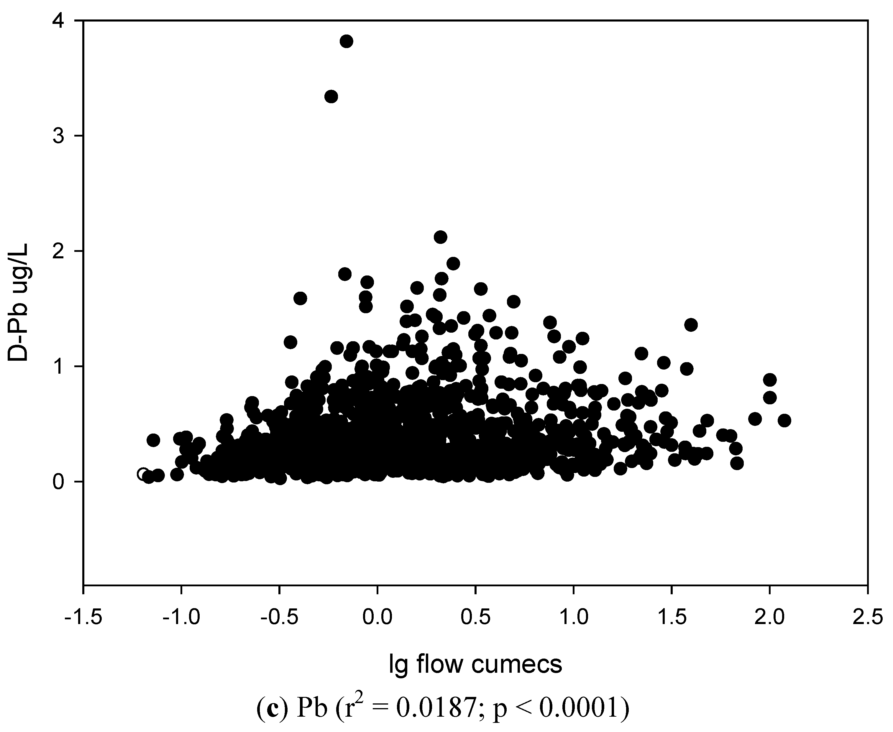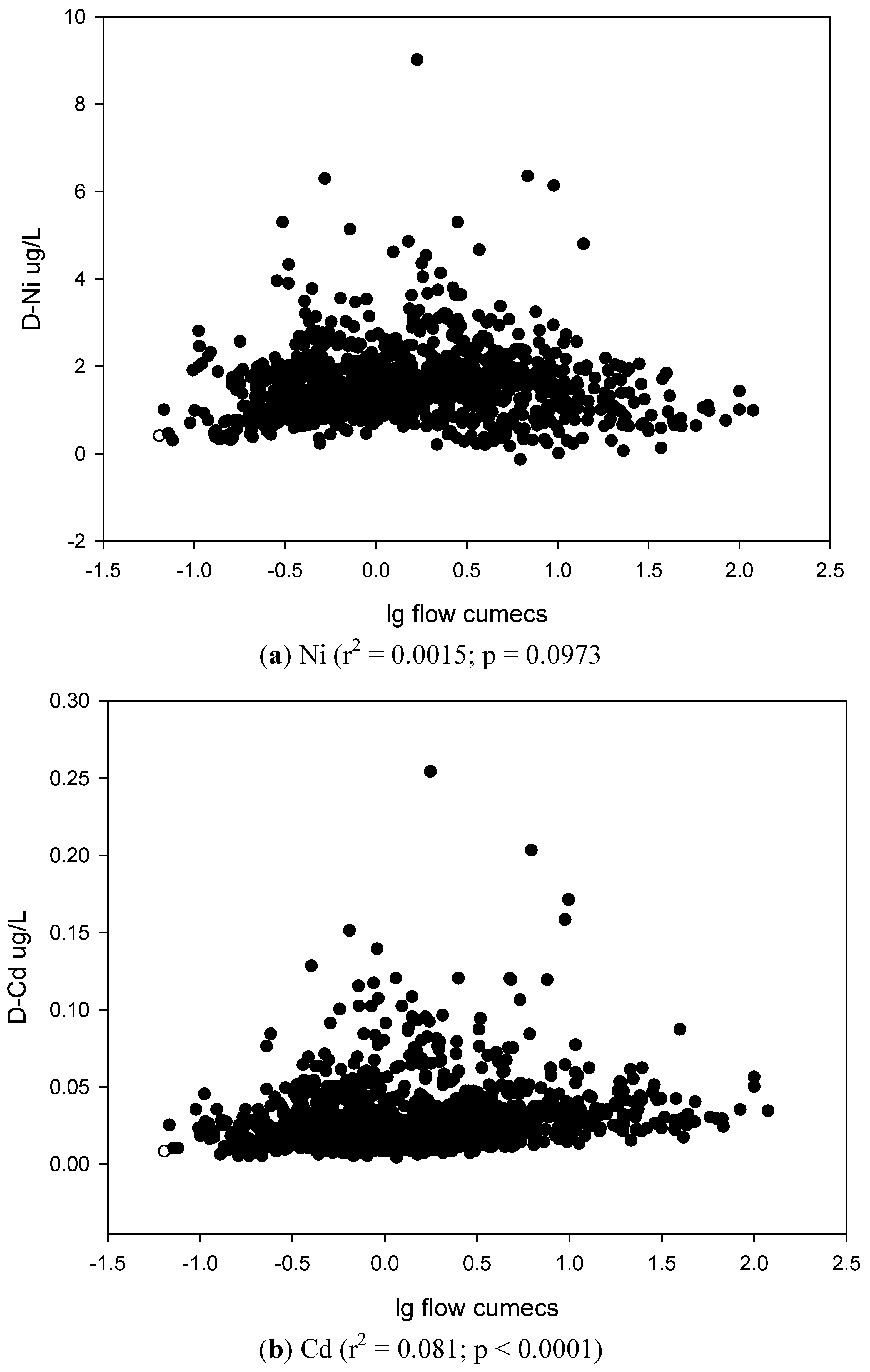 The relationships of concentration with flow for the dissolved metals (a) Ni, (b) Cd, and (c) Pb.